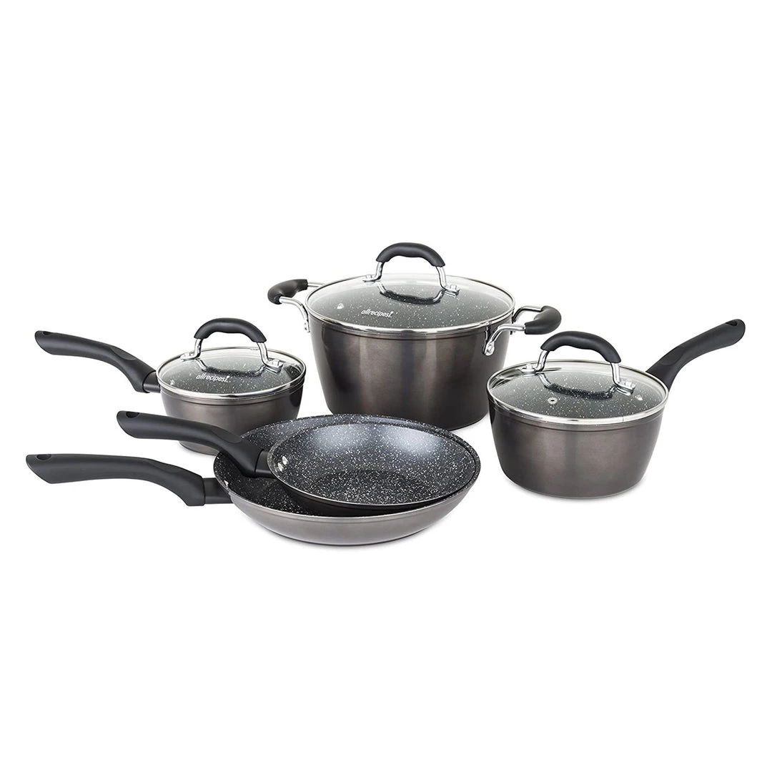 - Set includes 8 and 10 inch fry pans, 1.5 and 2 quart sauce pans with lids and 5 quart Dutch oven with lid.