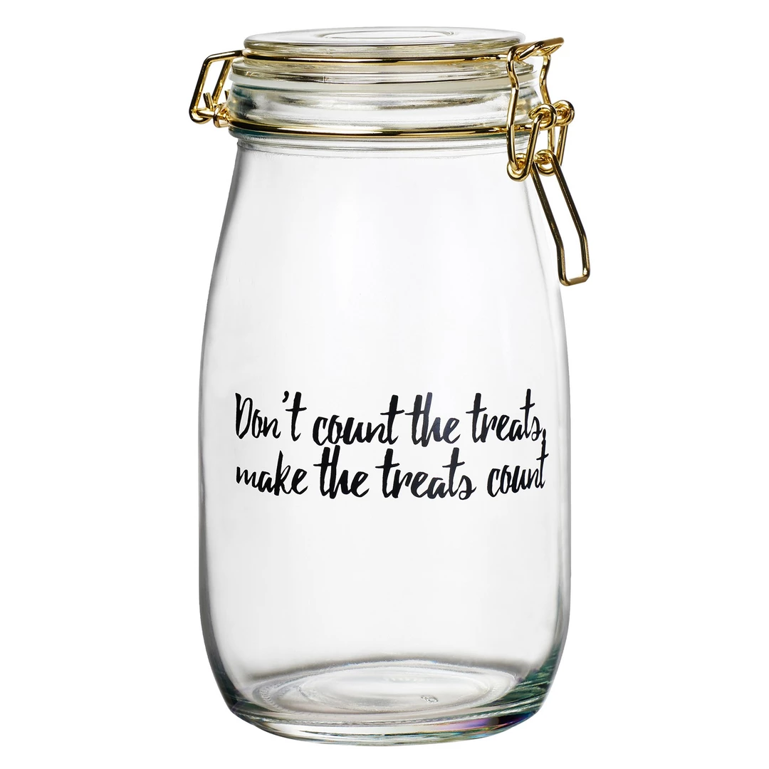 Amici Pet’s Wanderlust Dog Canister Medium features a hermetic seal with metallic gold clippers. The glass jar features artwork that says “Don’t count the treats, make the treats count” – perfect for any pup ready for an adventure! Each canister can hold up to 51 ounces and should be washed by hand.