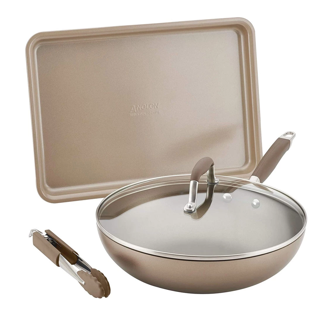 - Sleek and modern, the bronze nonstick exterior adds a timeless touch of style to any kitchen, and Anolon Sure Grip handles provide a confident, comfortable grasp. The included 9-Inch Locking Tongs make it easy to flip, turn and stir everything from Crispy Lamb with Yogurt and Scallions to a Chicken Marengo and garlic crostini’s.