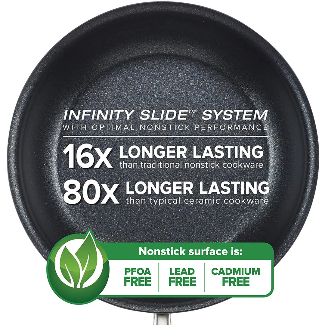 - OPTIMAL NONSTICK PERFORMANCE: Sapphire-reinforced Infinity Slide(tm) nonstick is PFOA-free and lasts 16X longer than traditional nonstick and 80X longer than typical ceramic cookware