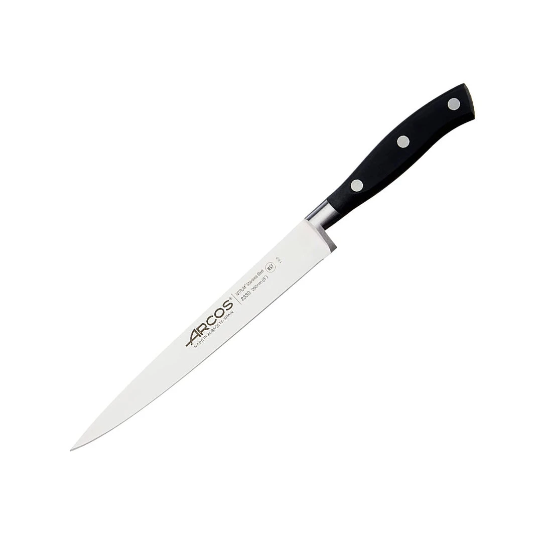 ARCOS leading European knife manufacturer, producing knives 100-percent made in Spain since 1745, introduces the Riviera series. Specially designed for cutting very thin slices of fish and meat the Arcos Riviera 8-inch forged slicing flexible knife is one of Arcos finest cutting tools. Its perfectly finished handle shows very soft curves that provide a perfect grip and comfortable handle. Recalls the classic French forged style with a touch of modernity and elegance. This line is perfect for those who look for a light forged knife and cares about design, but values the traditional balance, resistance, and perfect grip provided by the classic French forged style The blade is made of forged nitrum stainless steel. It offers durability, toughness, is razor-sharp, and is rust-resistant. The handle scales are made of polyoxymethylene (POM) and is highly resistant to impact, abrasion, and solvents. Rivets are made of stainless steel ensuring extremely high corrosion resistance. Originally Arcos produced knives exclusively for the professional. Due to its high cutting power ( over 100 mm ) and long edge retention ( over 350 mm) which made Arcos knives leader in the commercial market, now Arcos knives are also available for the end-users that want to feel in their hands a precise cutting tool used by professional chefs worldwide