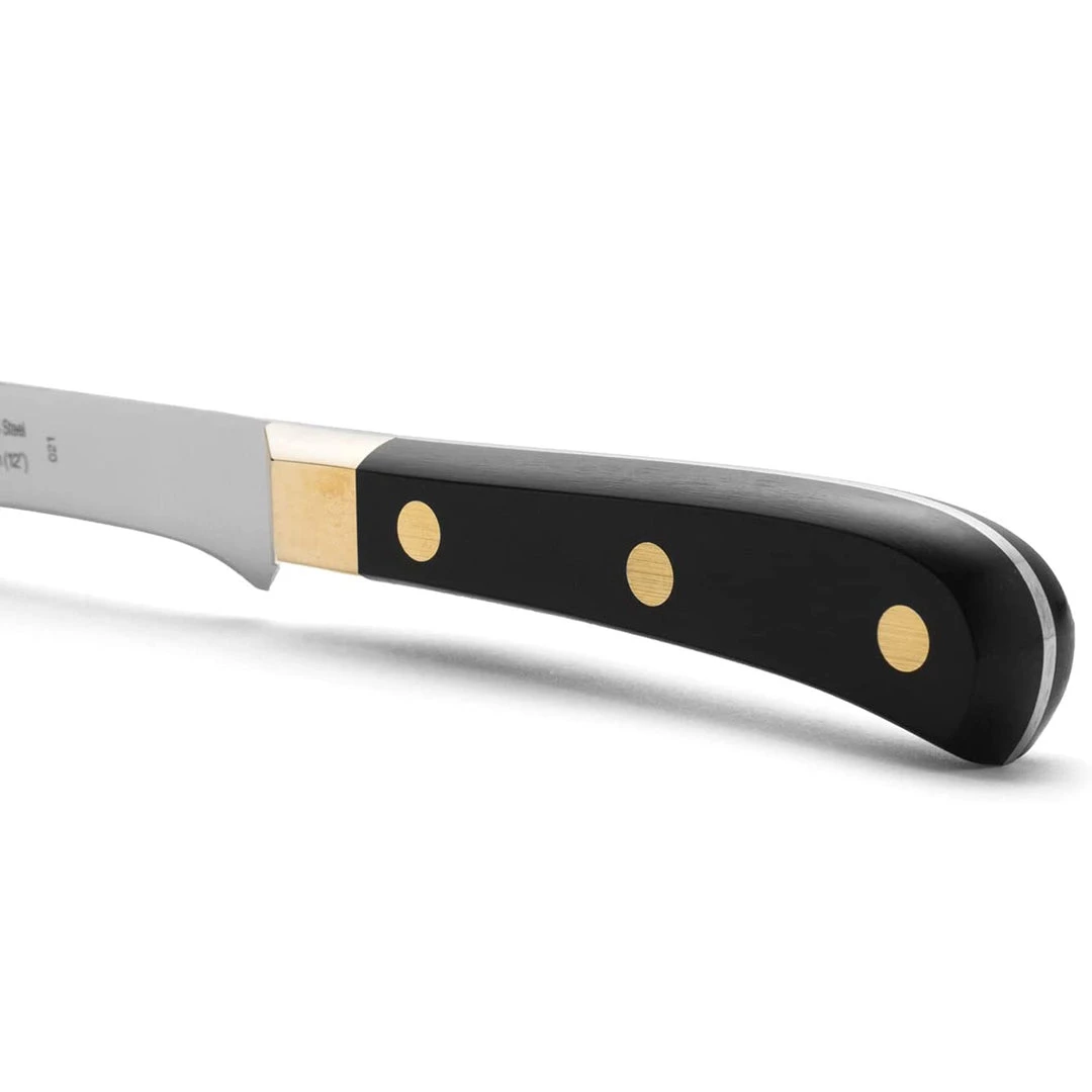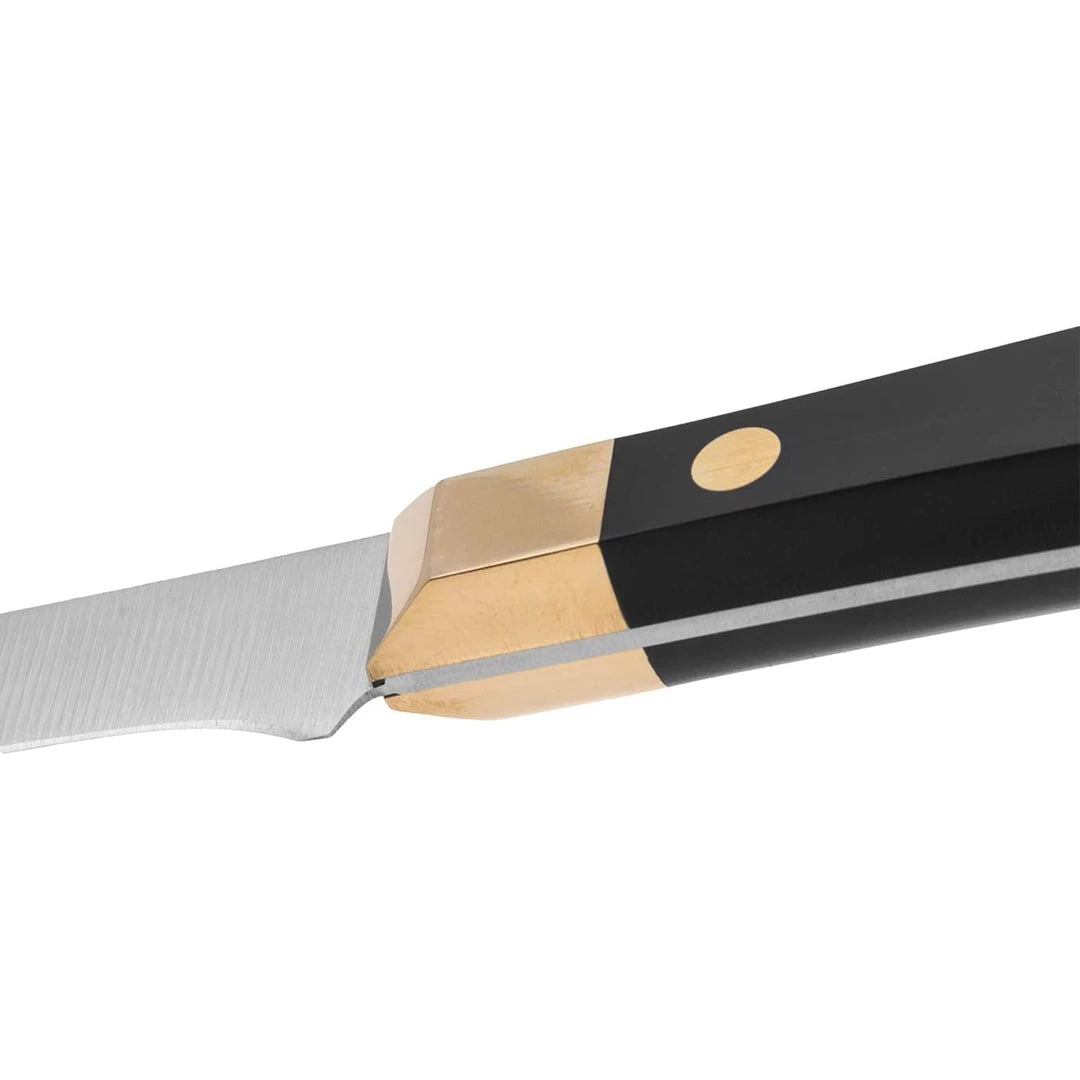 The elegance of combining black with gold makes it a classic. Exclusive, high usable and lasting NITRUM® stainless steel. The handle scales are made of polyoxymethylene (POM) and is highly resistant to impact, abrasion, and solvents and is able to withstand high and low temperatures between -40ºC to 150ºC. Rivets and bolster are made of brass which is highly resistant to corrosion. The attractive gold color also adds a touch of class and elegance to the design. 1 piece in a case.