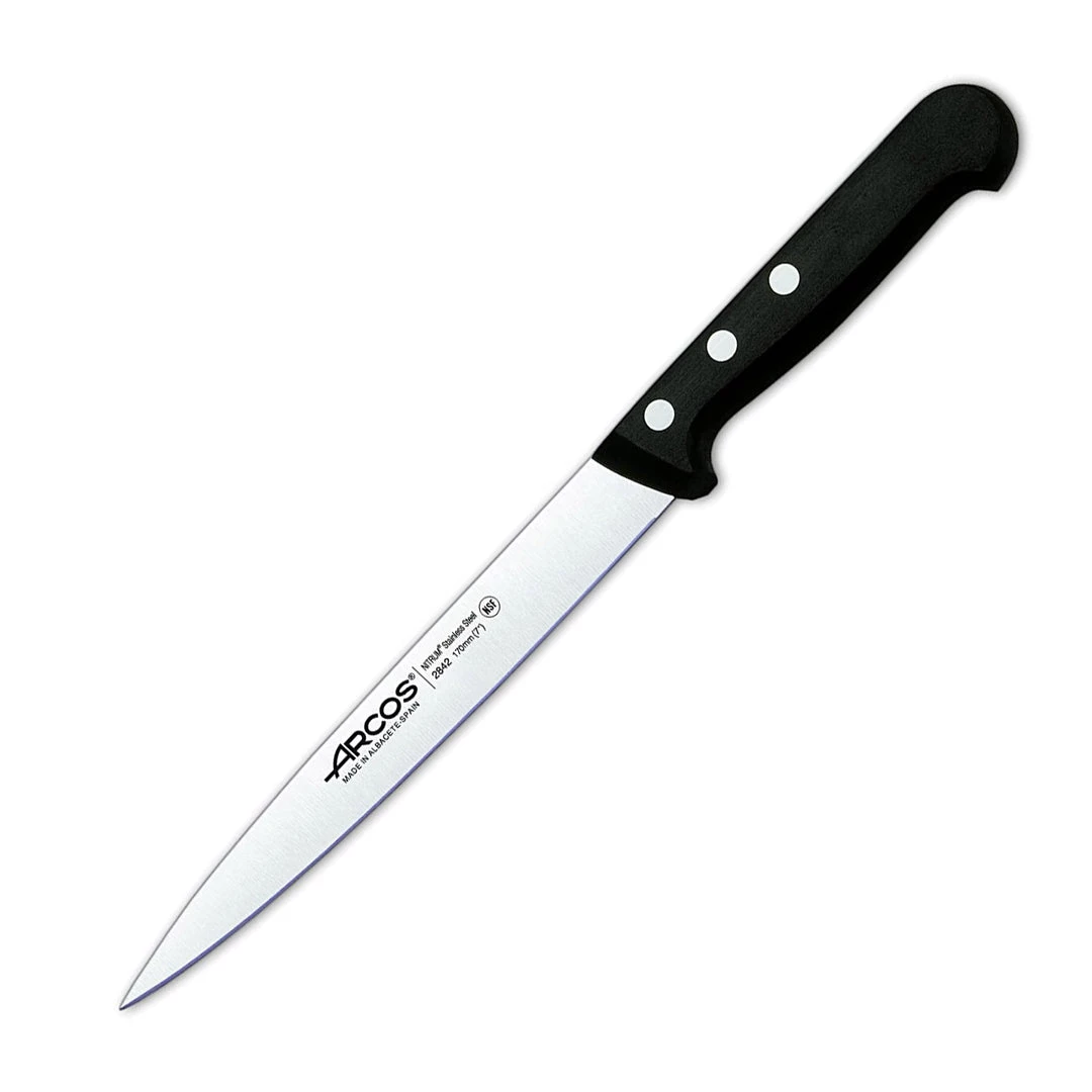 ARCOS leading European knife manufacturer, producing knives 100-percent made in Spain since 1745 introduces Universal series. The Arcos Universal 6 pcs knife block set includes the following: 4-inch vegetable knife, 7-inch slicing flexible knife, 8-inch bread knife, 6-inch kitchen knife, 8-inch chef knife, and pine block. A work of art in every way. The blade is made of NITRUM stainless steel. If offers durability, toughness, is razor sharp, and rust resistant. The elegant ergonomic handle offers a modern contemporary design along with durability and comfort. The handle scales are made of polyoxymethylene (POM) and is highly resistant to impact, abrasion, and solvents. Rivets are made of stainless steel ensuring extremely high corrosion resistance. Originally Arcos produced knives exclusively for the professional. Due to its high cutting power (over 100 mm) and long edge retention (over 350 mm) which made Arcos knives leader in the commercial market, now Arcos knives are also available for the end users that wants to feel in theirs hands a precise cutting tool used by professional chefs worldwide.
