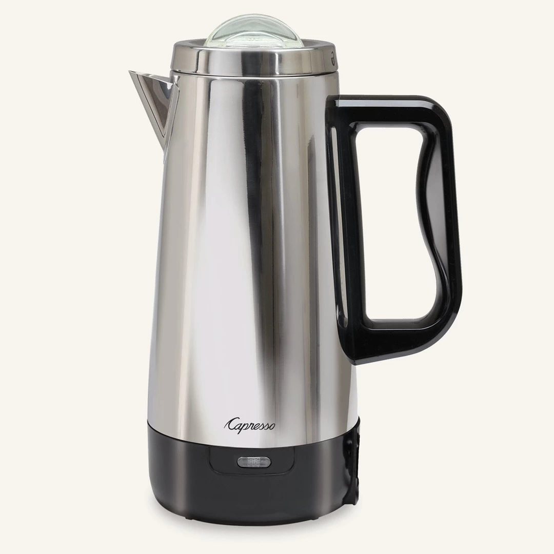 The 12-Cup Perk features elegant, durable stainless steel construction, with a view-through glass lid that showcases the percolating process. It brews 4 to 12 cups of piping, hot coffee in less than a minute per cup. Its automatic keep-warm function ensures that coffee is ready whenever you want it. The 12-Cup Perk is simple: fill with water, ground coffee, plug in and brew. Ideal for parties and special occasions, it features a drip-free pouring spout and detachable power cord to simplify serving.