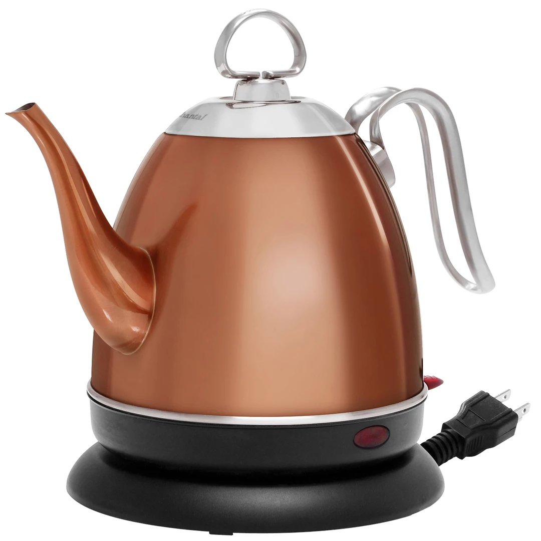 The Mia Ekettle® from Chantal® features a spout and handle design that make a “Pour-Over” feel natural and easy. All stainless-steel interior – no plastic! Along with a slow pour spout for handcrafted coffee perfection, the spout cools boiling water to the ideal brewing temperature of 205° F when pouring. This cordless water kettle boils water fast and is perfect for small spaces! The automatic shut off makes this electric kettle the easiest way to boil water and the boil-dry safety protection mechanism means it is safe for everyday use. “Pour-Over” coffee instructions included. 4 cup / 32 oz. capacity. Limited 1 Year Warranty