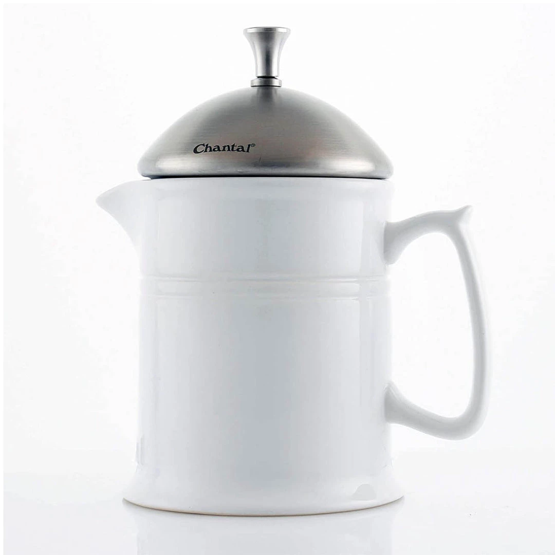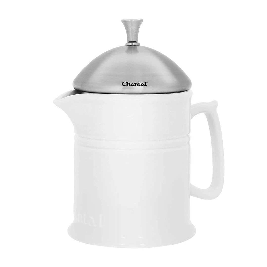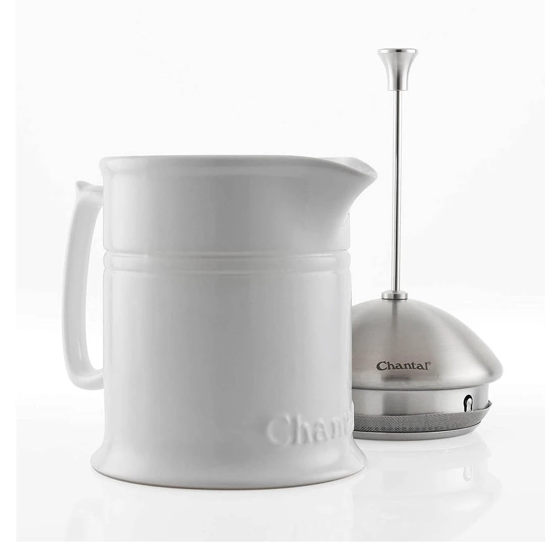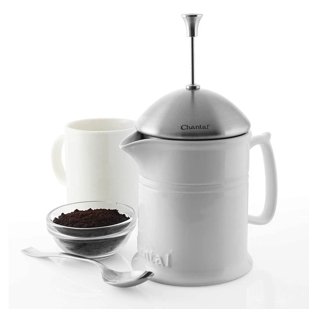 Brew your own coffee with Chantal’s uniquely designed Ceramic French Press! An essential eye grabbing piece in any kitchen, Chantal is proud to introduce this item as part of the Craft Coffee Collection! The unique thumb handle facilitates easy handling and pouring when you are ready to serve. The design of the body has a maximum fill line that precisely lets you know how much water to put into the carafe, preventing spillage. Stainless steel plunger includes a fine mesh screen which prevents sediments from escaping. The ceramic body is sure to keep your coffee warm since ceramic clay holds the temperatures longer than glass or stainless steel!
