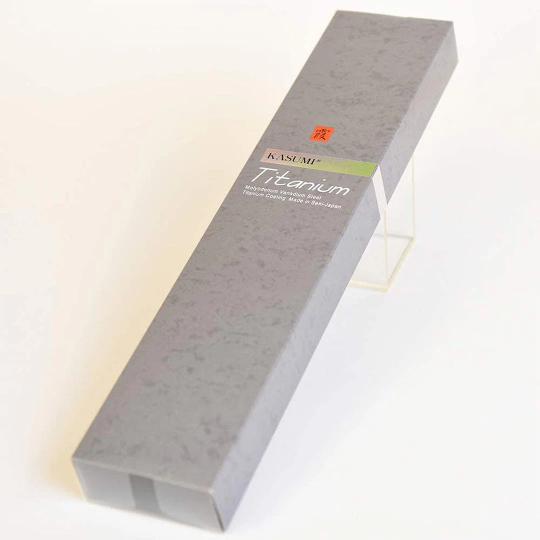 The blade is manufactured in molybdenum vanadium steel with 2 colors of titanium coating (blue and gold) a material affording the sharpest edge possible by the combination of steel and titanium. The outstanding edge of the Kasumi titanium-coated blade has been achieved by combining the best of advanced technology with the unsurpassed knowledge and expertise of the craftsmen making these professional kitchen knives. Their skills have been cultivated in the traditional Japanese techniques of sword making, handed down from generation to generation for over 780 years in the capital of swords and knives, Seki, Japan.