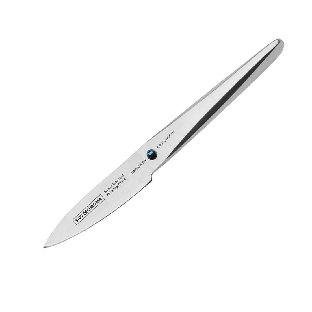 3 1/3 inch Paring Knife Chroma Turbo blue german blade steel made by ThyssenKrupp The Turbo has on the edge an HRC of 61* while the rest of the knife keeps pretty flexible at 56* HRC. ThyssenKrupps Turbo steel passes all European Union food tests for Food Contact Materials (FCMs).