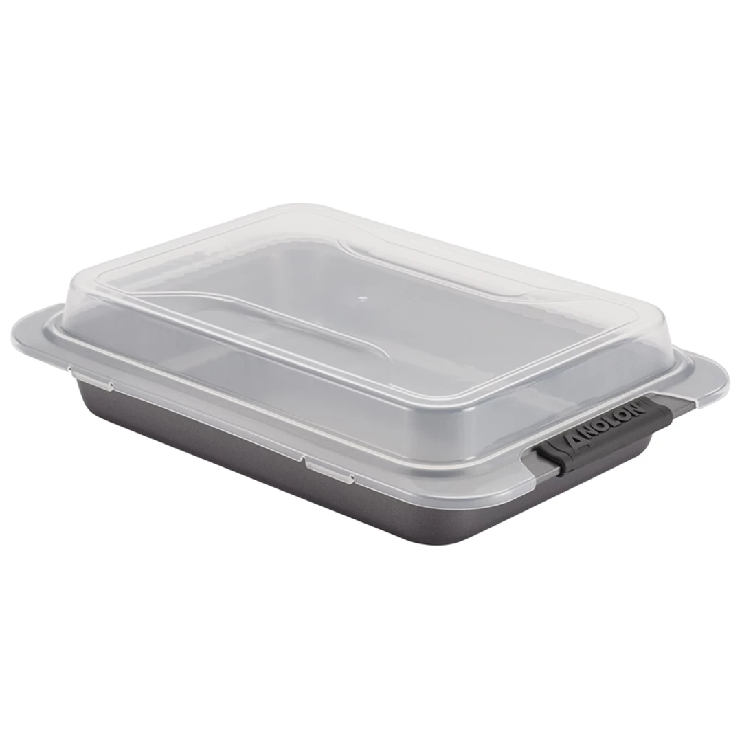 Take desserts, baked treats, and main courses and sides on the go baked and transported with the Anolon Advanced Nonstick Bakeware 9-Inch by 13-Inch Covered Cake Pan with Silicone Grips.