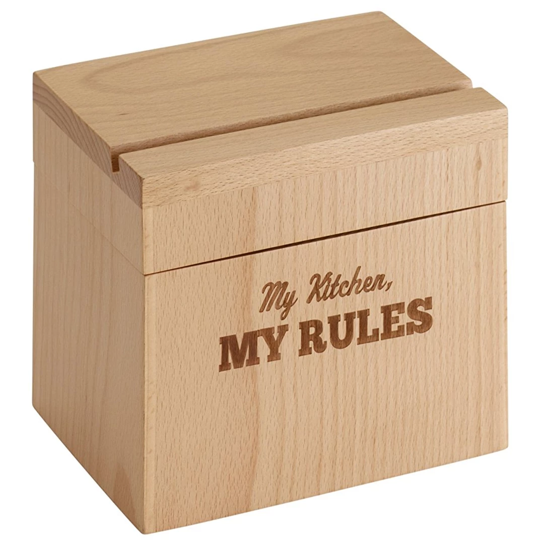 Show you’re the boss in the kitchen with the handy Cake Boss™ Countertop Accessories Beechwood Recipe Box with “My Kitchen, My Rules.” Cake Boss Countertop Accessories make baking more enjoyable, and this beechwood recipe box is a cool, vintage-styled piece with great looks and usefulness for both novice and experienced bakers. It features a smaller beechwood frame that securely props recipe cards on the lid of the box for easy reference while baking. Featuring a fun “My Kitchen, My Rules” design on the front, the recipe box comes with eight pre-printed dividers, four pre-printed recipes and 25 blank recipe cards so bakers can record their favorite prized recipes for decadent chocolate cake, delicious apple pie and more. And it’s the perfect place to store cherished recipes received from family and friends. The recipe box looks great sitting out on countertops, and makes a perfect gift for bakers of all levels. Cake Boss Countertop Accessories like this recipe box complement the other great items in all the Cake Boss collections.