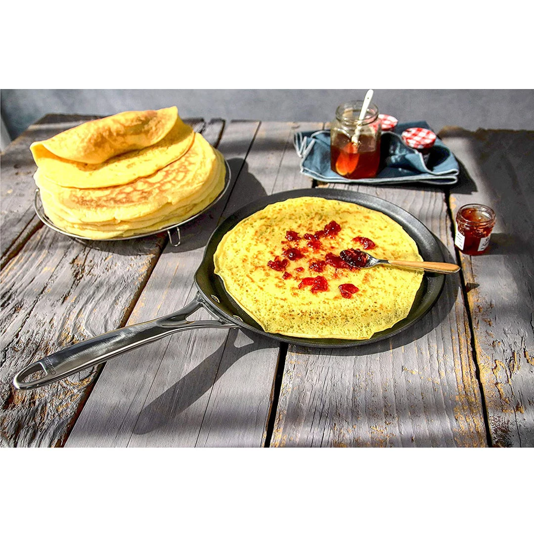 Whip up a pancake breakfast or savory crepe lunch with this Castel Pro Ultralu crepe pan from Cristel. This line was imagined and designed in collaboration with renowned Michelin-starred chefs, so each product meets the requirements of the greatest professionals. Featuring a three-ply design reinforced with an anodized aluminum core, this pan provides exceptional thermal efficiency, even heat, and no hot spots. The highly responsive cooking surface with Exceliss non-stick coating without PFOA heats up and cools down rapidly, providing excellent control on the stovetop. Fixed to the body of the pan thanks to stainless rivets, the solid, stainless steel handle does not retain heat, making for a safe and comfortable grip. Cristel ULTRAPLYlight technology allows gentle cooking techniques such as fat-free and low-temperature cooking, which preserve vitamins, the texture of the food, color, and enhance flavors. When you’re finished cooking your favorite meals, place this pan in the dishwasher for easy cleanup.