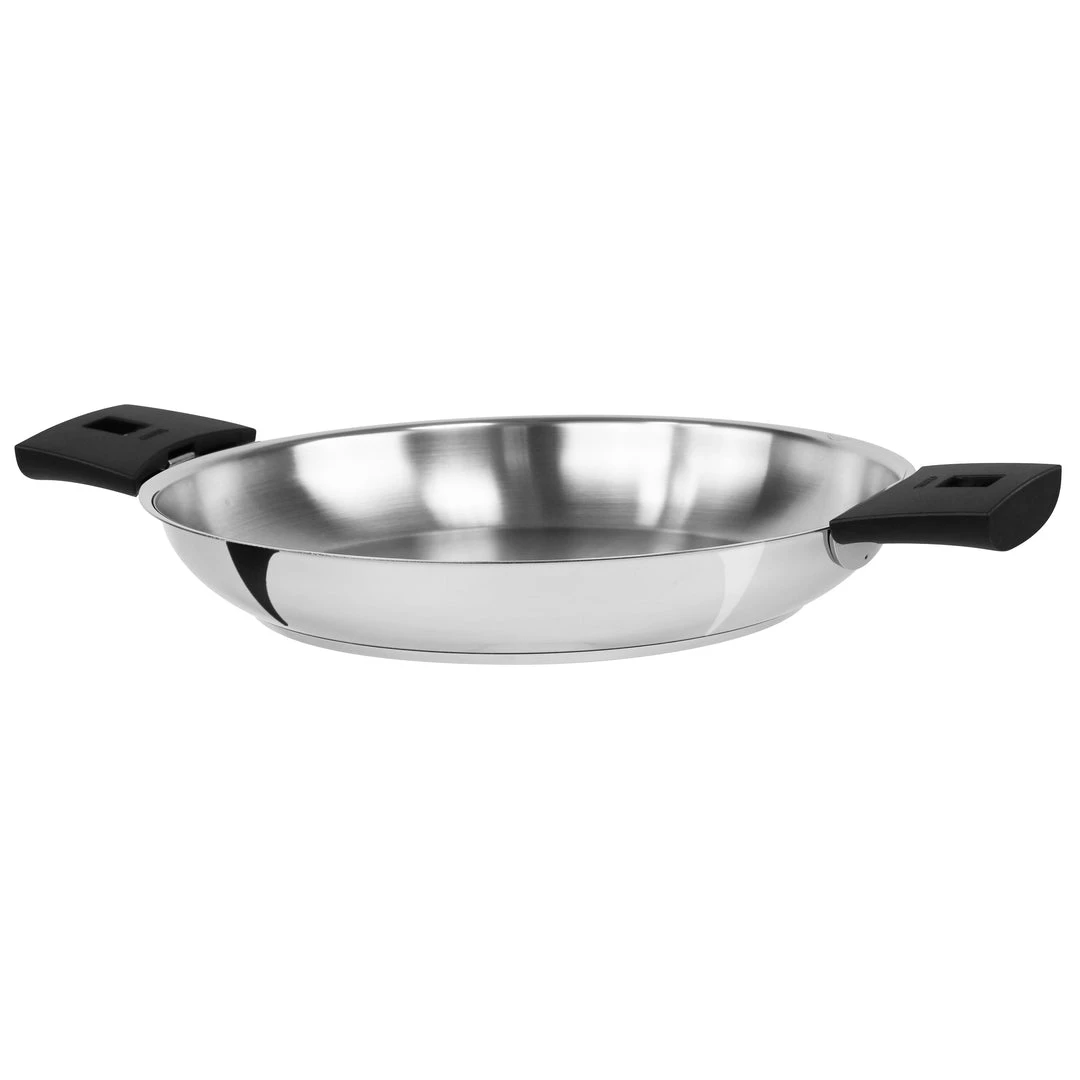 Frying pan Stainless steel 18/10, shiny finish, detachable handle, from Mutine collection. A must have in the kitchen, Mutine frying pans are available in 6 sizes: 8”, 8.5”, 9.5”, 10”, 11” and 12”. Ideal for searing meat, stainless steel frying pans with detachable handle allow, thanks to the quality of their diffuser base, to cook perfectly without water or oil or fat.