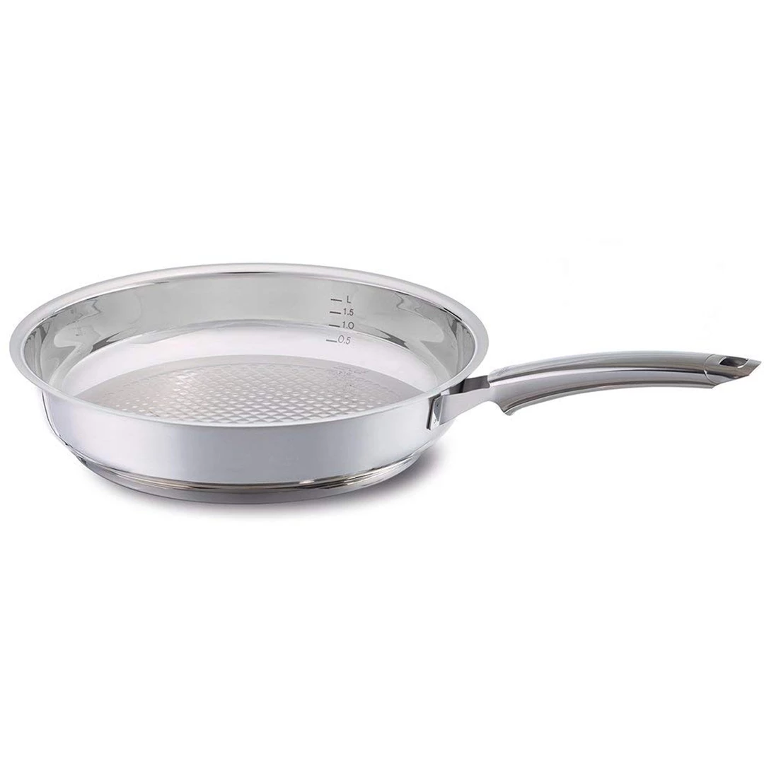 The Novogrill surface on Fissler Crispy Steelux Premium fry pans create a grilling effect on food without the fat external crispy frying and generates a “non-sticki experience without the coating or need for fats and oils. Novogrill utilizes the grooved surface of the pan to allow steam to escape so foods sit on top of fats and oil without direct contact cooking food in a healthier and better tasting way. With the patented “Cookstari all stove base, the fry pans create perfect stability for optimal heat absorption and distribution, cooking foods better and faster on every stove top making these pans “future-proofi. Ergonomically designed stay-cool metal handles for comfort and ease of use.