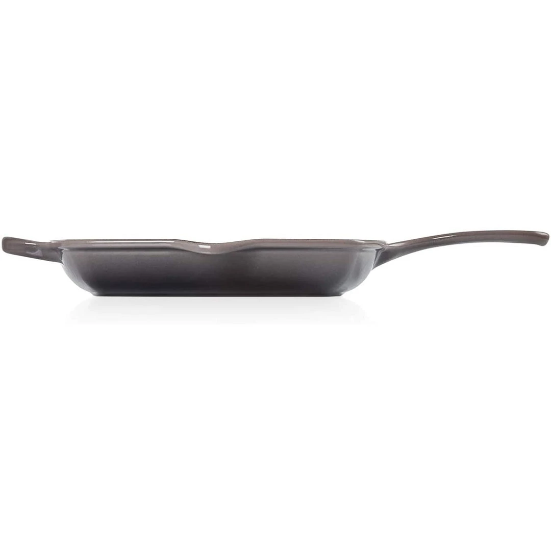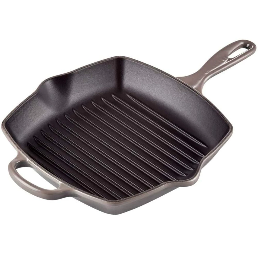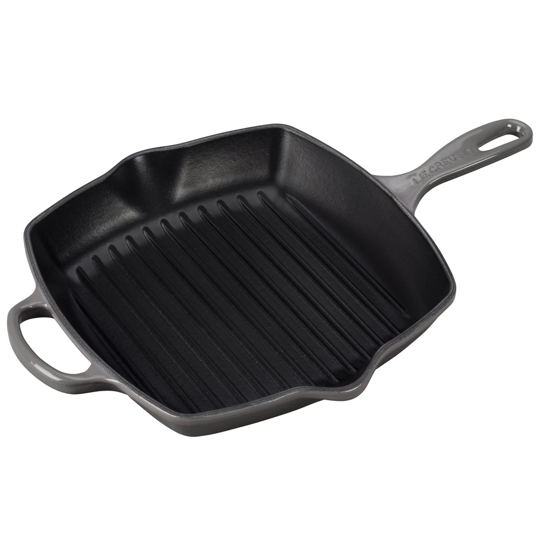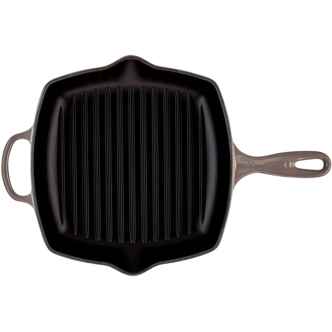 The square Skillet Grill’s interior is coated with Le Creuset’s protective satin black finish to prevent damage and wear. Over time, this slightly abrasive interior develops a natural patina that is ideal for searing and frying.