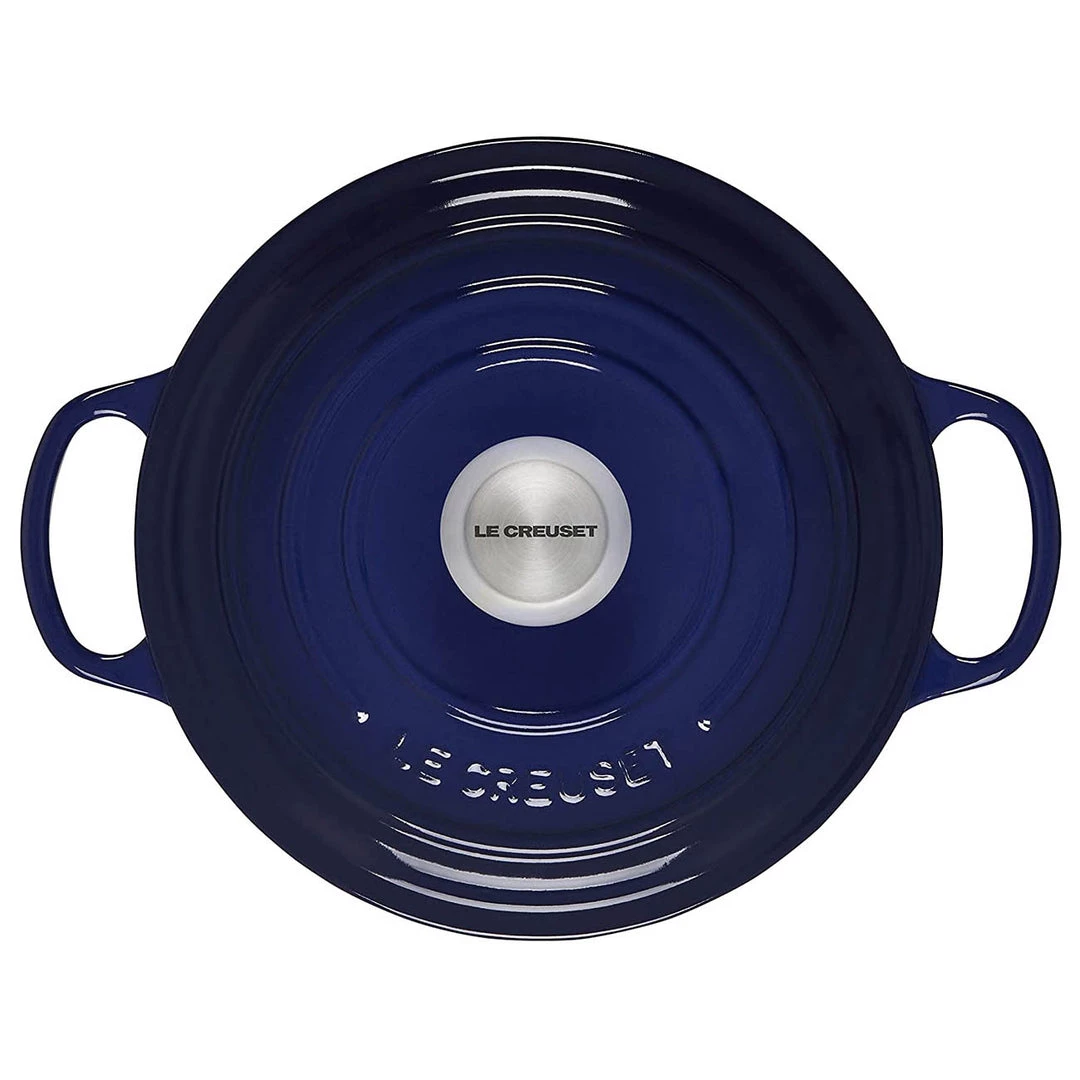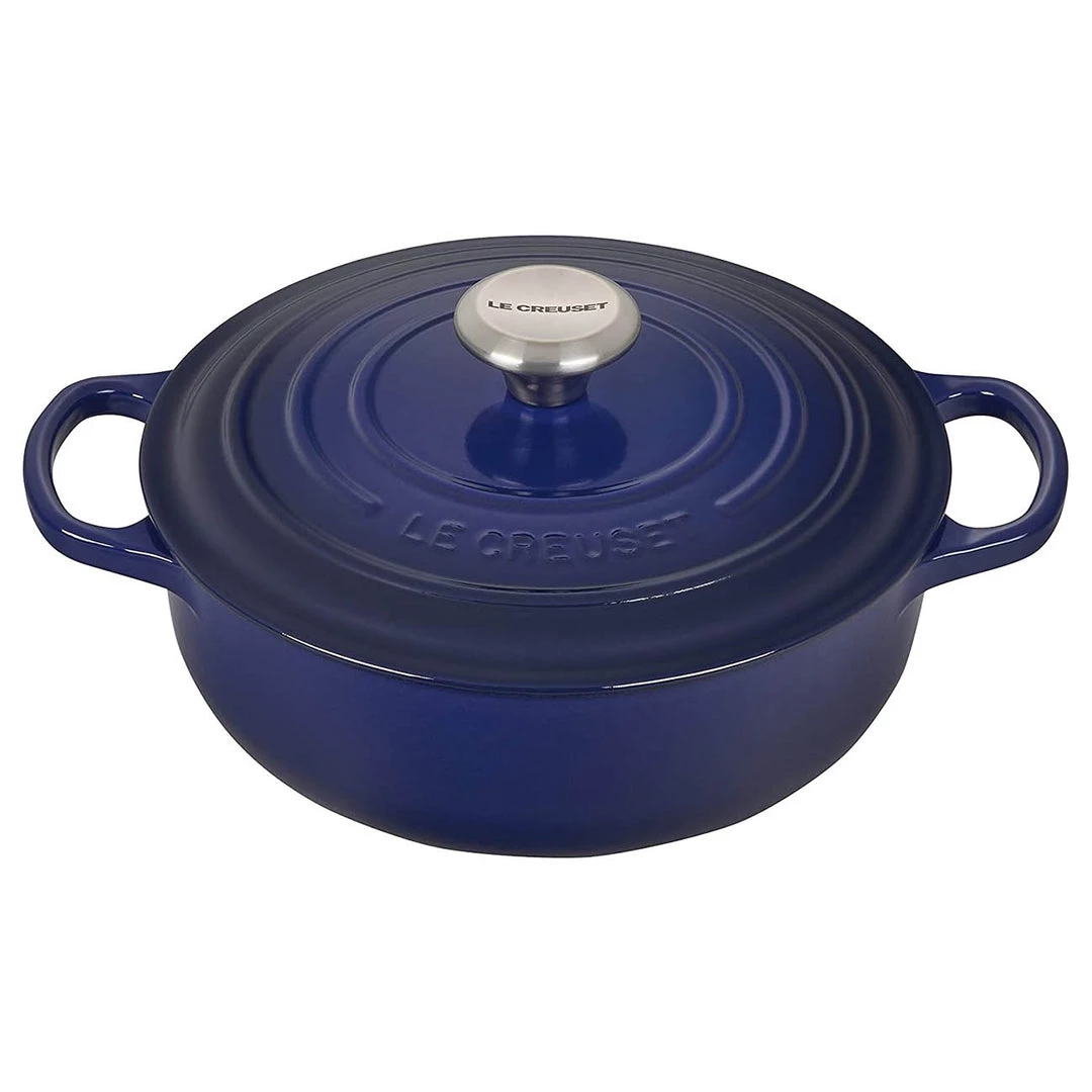 Its cast-iron construction enhances the cooking process by evenly distributing heat and locking in the optimal amount of moisture. The interior enamel resists chipping and cleans evenly, and ergonomic handles provide a secure grip, even while wearing oven mitts.