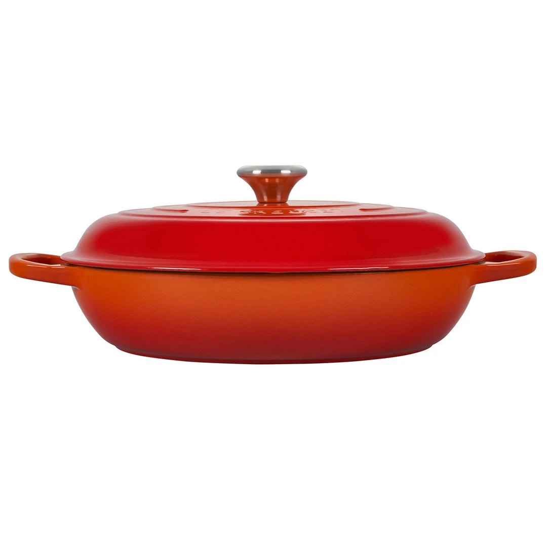 The enameled cast iron braiser is uniquely designed for maximum performance, transforming tough cuts of meat and hearty vegetables into tender, flavorful dishes. Food is first seared over high heat, then finished slowly in a flavorful liquid. The wide base of the braiser allows ingredients to be placed in a single layer for proper searing; once liquid is added, the domed lid continuously circulates steam to lock in moisture and flavor.