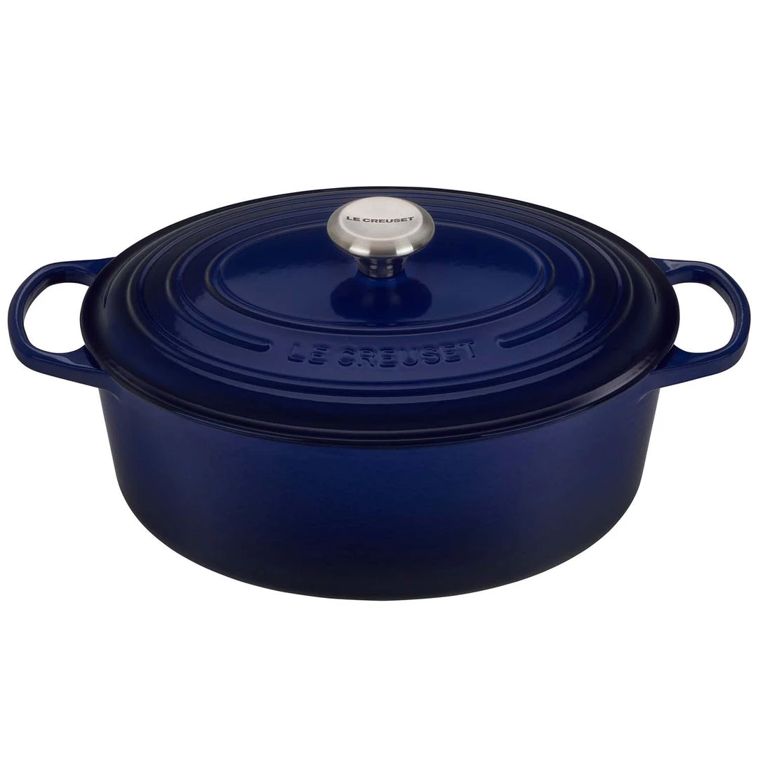 The iconic Le Creuset Dutch oven is indispensable in the kitchens of home cooks and professional chefs alike. Long recognized for its strength and durability, cast iron is the prime material for slow-cooking, braising and roasting, thanks to its ability to maintain even and consistent heat. The enameled Dutch oven needs no seasoning, and it’s suitable for both stovetop and oven use. The oval shape is particularly suited to longer cuts of meat or poultry.