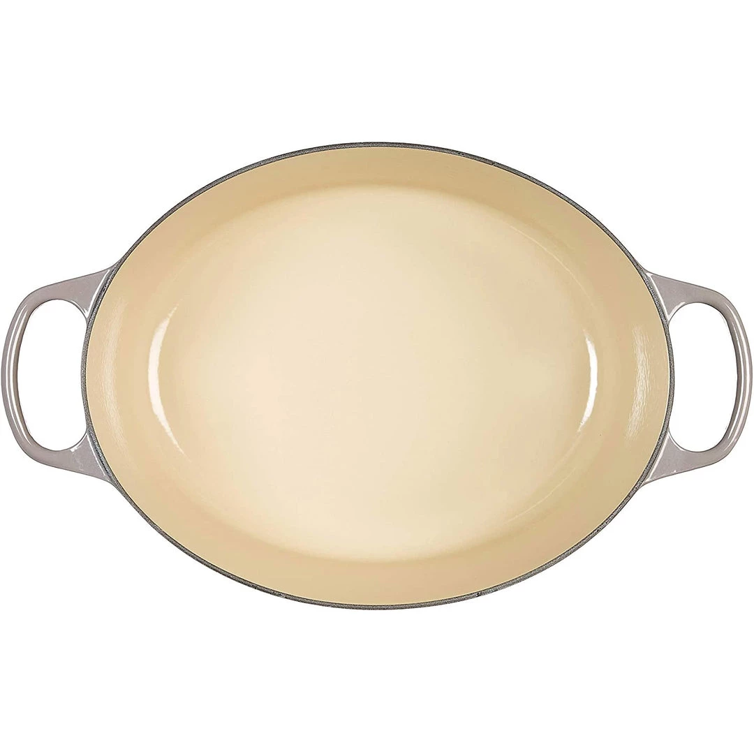 - Sand-colored interior enamel has a smooth finish that promotes caramelization, prevents sticking and resists stains
