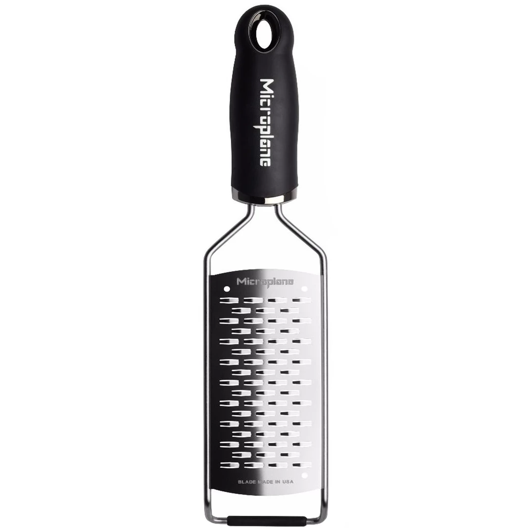 The Microplane Gourmet Series has an expansive paddled with ample grating surfaces and US made stainless steel blades. Ultra-sharp photo etched teeth make fast work out of grating potatoes, carrots, onions and cheeses. The Stainless steel frame provides extrondinary durabilty. The soft touch handle matches back to the premium classic series zesters. The non-skid foot adds stability when grating on counters and plates.