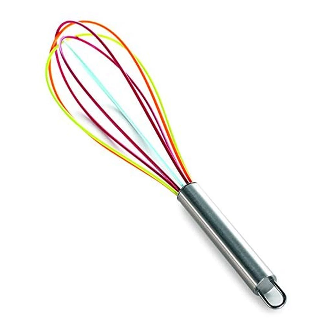 The multicolored silicone wires on this whisk are not only cheerful, but practical, too: no more tricky, sticky cleanup! Silicone wipes and rinses clean easily.