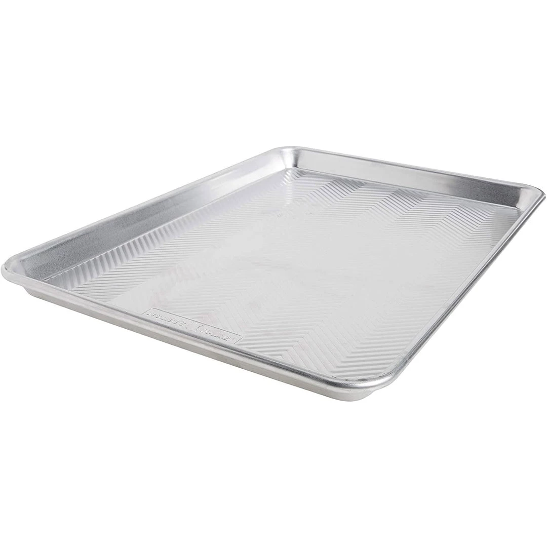 - Natural aluminum affords the best possible heat dispersion to create perfectly browned baked goods every time and the reinforced encapsulated steel rim prevents warping