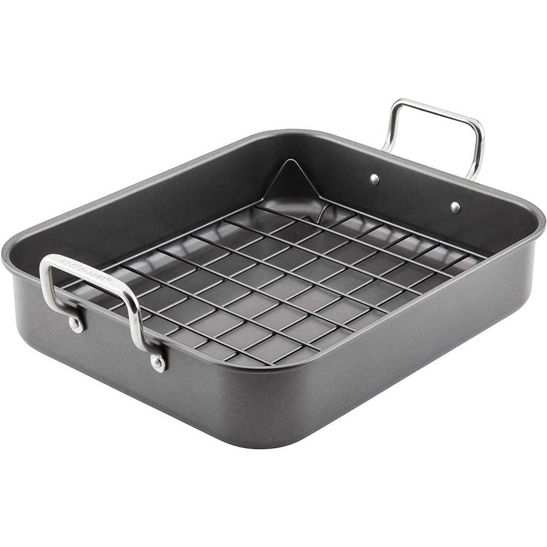 Bring on big family roasts, turkeys, hams and more with this super functional and easy handling Rachael Ray Nonstick Roasting Pan with Reversible Rack. The 16.5-Inch x 13.5-Inch roasting pan can handle large cuts of meat and poultry, and the reversible rack keeps foods off the bottom of the roasting pan for even browning. Both the roasting pan and rack feature high-quality nonstick for easy food release and fast cleanup, and the roasting pan set is oven safe to 450 degrees F. Wide handles offer comfort and control, even when moving big meals in and out of the oven.