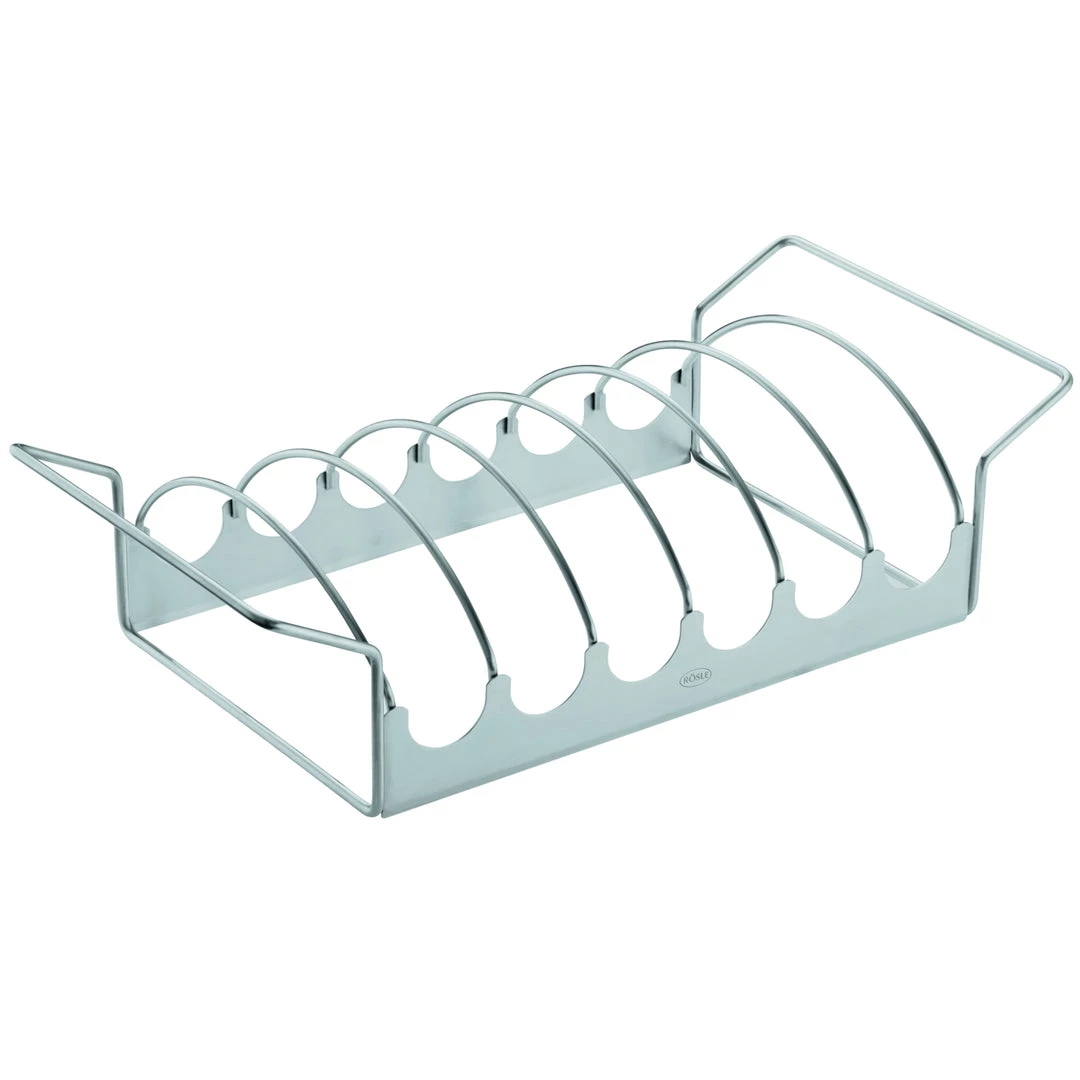 Rack for pork chops and spare ribs that transforms into a roasting basket when turned upside down. Entire roasts can be safely and securely transported in the basket. With practical lateral handles.