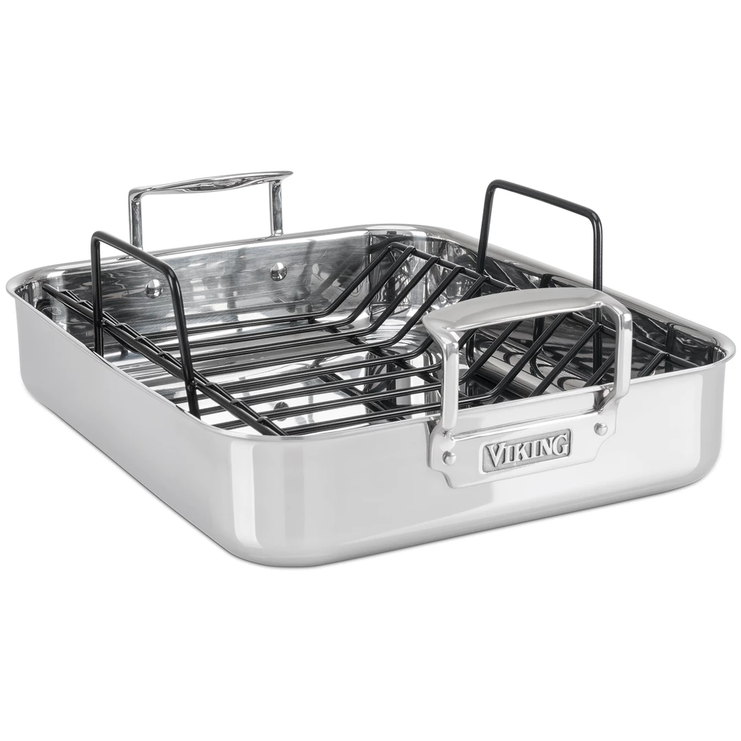 Viking designed this roasting pan with the home cook in mind by integrating several unique features. The unique inverted handles allow the roaster to fit into ovens with ease, minimizing space versus roasters with handles extended outward. The inverted handles also make the roaster ergonomically easier to put into and take out of the oven. The roaster can fit up to a 25 point bird and comes with a v-shaped, PFOA and PFOE free Eternal Non-Stick cooking rack. The elevated rack helps cook food quicker and more evenly. The 3-Ply Stainless Steel clad design combines three layers of metal to create one solid piece that is formed into the vessel. An induction capable stainless steel exterior is bonded to a layer of aluminum alloy and then finished with a final layer of high quality 18/10 stainless steel on the interior. The three-layer construction combines the durability of stainless with the superior conductivity of aluminum, delivering even heat distribution along the bottom and throughout the sides of the pan.