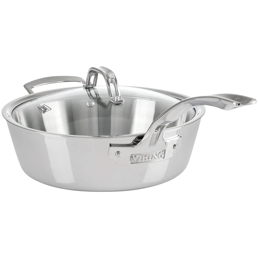 The Viking Contemporary 3-Ply Stainless Steel 3.6 Quart Sauté Pan with Lid combines a modern, Windsor pan inspired design with the exceptional performance of 3-Ply stainless steel cookware. The conical sides are angled out to provide more surface area for evaporation, while the walls retain more heat resulting in faster cooking times. The vented glass lid allows you to monitor the cooking progress of your meal while reducing the chance of boil-overs. Additional features include a unique sealed rim that completely encapsulates the aluminum layer inside the stainless steel. Internal volume markings in both US and metric units make measuring easy. All Viking Contemporary cookware combines a layer of aluminum sandwiched between heavy-gauge stainless steel. The aluminum core provides exceptional heat transfer throughout the cookware, while the magnetic stainless steel exterior makes it incredibly durable and safe for all cooktops, including induction. The Viking signature stay-cool handle is ergonomically designed for a secure grip, comfort and balance, while remaining cool to the touch. Oven, broiler and grill safe up to 600°F/315°C (oven safe up to 450°F/232°C with glass lid), dishwasher safe and features a manufacturer’s limited lifetime warranty. Viking, designed to delivery Professional Performance for Your Home.