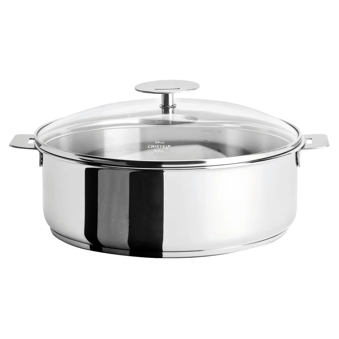 Thanks to the efficiency of their Cristel thermo-diffuser base, compatible with induction, the Casteline Detachable handle system fits all kitchen sizes and will be a valuable ally for all your culinary preparations. Practical, the detachable handle system makes it possible to transform your stainless steel vessel into a serving dish by replacing the long handle with short handles.