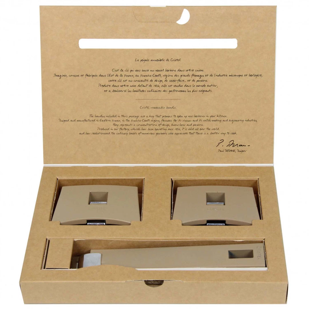 The latest in Cristel detachable handles, this set of Mutine handles (1 long Handle and 2 side handles) combines stainless steel from the cooking utensils of the Mutine collection and bakelite. These handles are suitable for all pots, pans, … of the various Cristel detachable collections.