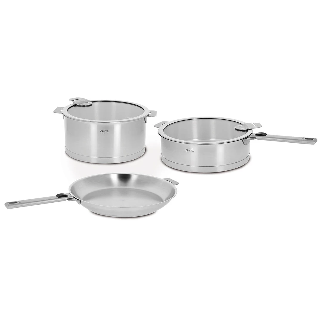Fry, saute and simmer your meals with this seven piece cookware set from the Strate collection by Cristel. Made out of aluminum sandwiched between two layers of 18/10 stainless steel plus a triple sole, they are durable and long lasting. The set includes a frying pan, saute pan, sauce pan and two removable long handles to help transport from stove to tabletop. Temperature is distributed evenly across the entire products for gentle, economical and tasty cooking. Furthermore, the wide and efficient pouring edge is sealed so that the aluminum core cannot enter into contact with food. Best of all, they include a limited lifetime warranty and is dishwasher safe to make clean up a breeze.