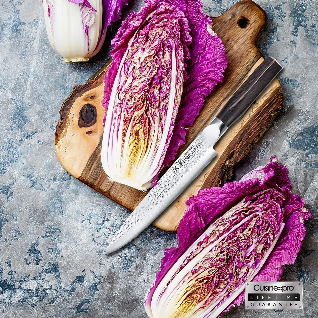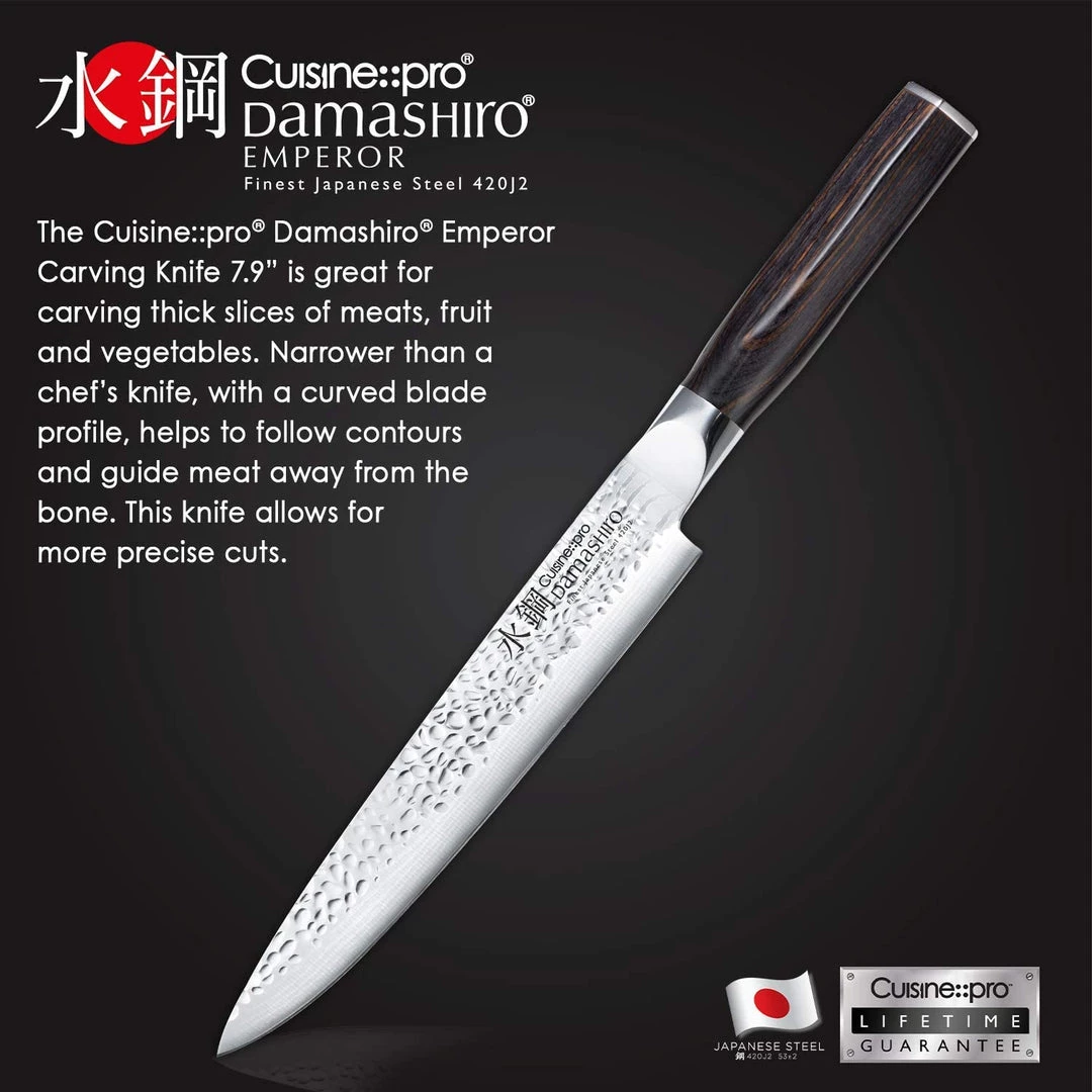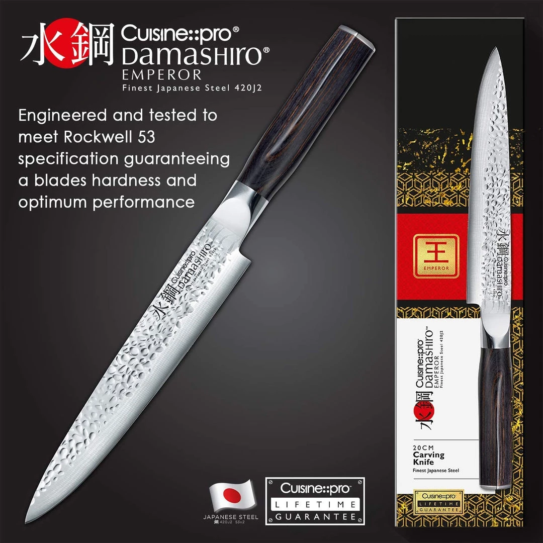 - Cuisine::pro Damashiro Emperor Japanese knives are made from the finest quality Japanese steel. Inspired by traditional Japanese craftsman and Samurai sword makers, these knives are characterized by distinctive Damascus inspired patterns on the blade of banding and mottling reminiscent of flowing water. Damashiro blades are made from specialist ice hardened Japanese steel which makes them super tough, resistant to shattering and capable of being honed to a sharp, resilient edge.