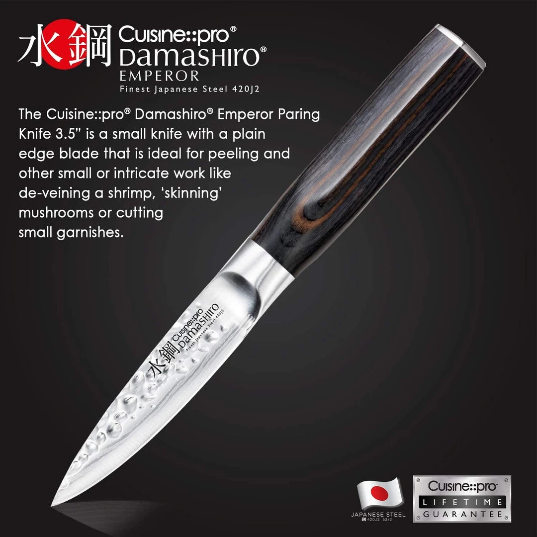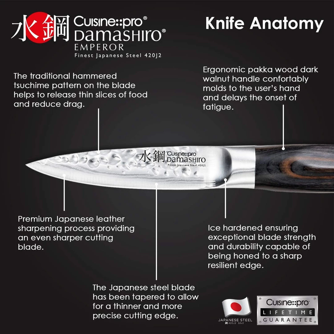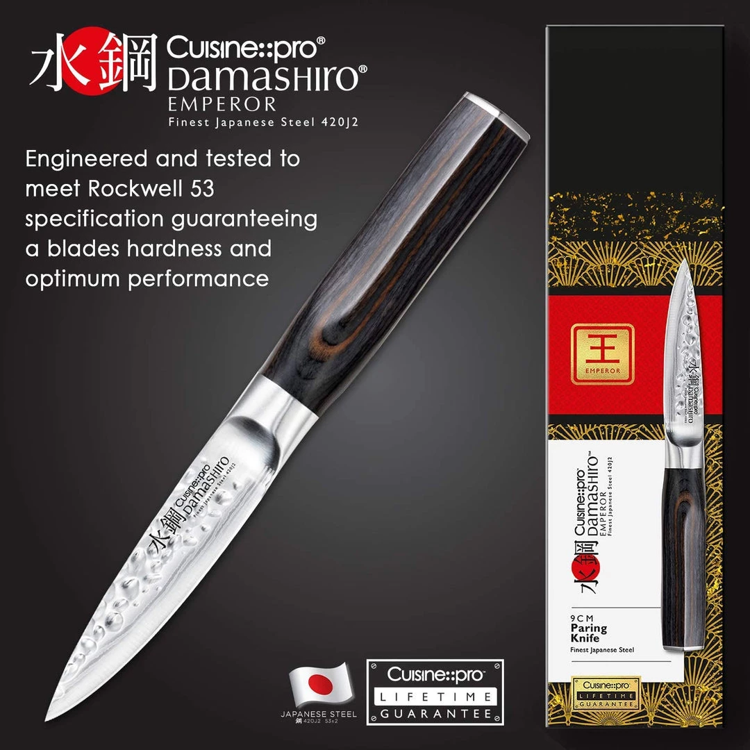 - Cuisine::pro Damashiro Emperor Japanese knives are made from the finest quality Japanese steel. Inspired by traditional Japanese craftsman and Samurai sword makers, these knives are characterized by distinctive Damascus inspired patterns on the blade of banding and mottling reminiscent of flowing water. Damashiro blades are made from specialist ice hardened Japanese steel which makes them super tough, resistant to shattering and capable of being honed to a sharp, resilient edge.