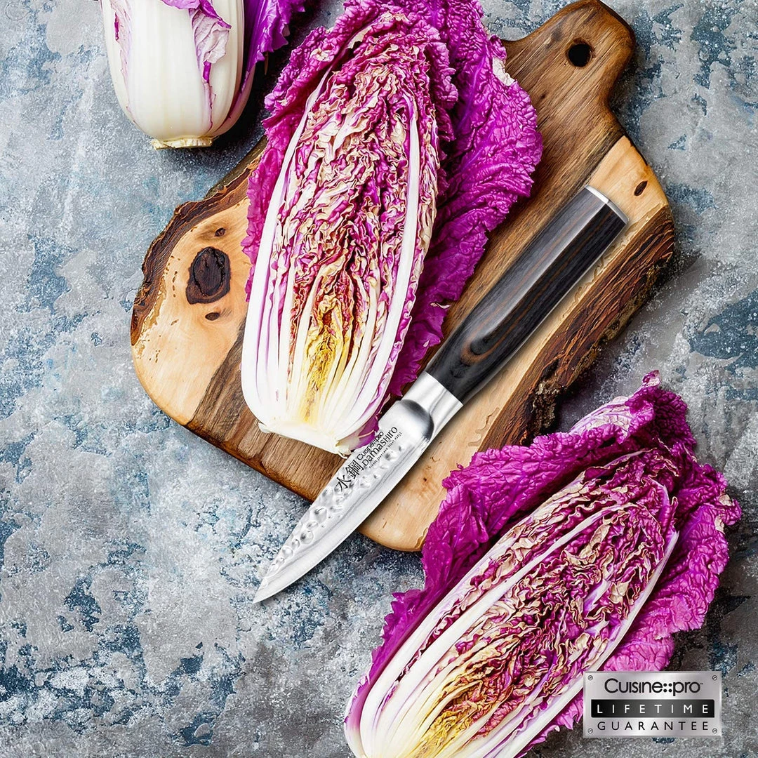 Experience professional quality in your kitchen with the Cuisine::pro® Damashiro® Emperor Pairing Knife. Ideal for peeling and other intricate work, the Damashiro® Emperor Paring Knife is an essential kitchen accessory. Crafted for maximum control and ease of use this premium knife from the Damashiro® range is extremely durable and comes with a life-time guarantee. The Damashiro® Emperor Paring Knife can be used for a great selection of cutting needs and is an ideal addition to your kitchen utensils for the ultimate cooking experience.