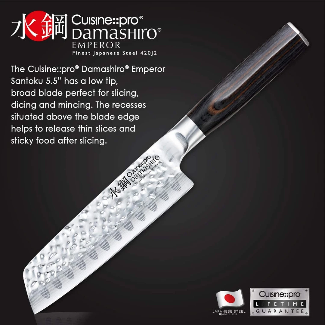 Expertly designed, the Damashiro® Emperor Santoku from Cuisine::pro® is the perfect kitchen knife for you. Experience effortless , excellent results with every use without putting too much strain on your hands. Splendidly designed and shaped for comfort and ease, the Damashiro® Emperor Santoku offers the best knife experience there is. With a traditional Japanese hammered tsuchime finish, the Damashiro® Emperor Santoku from Cuisine::pro® features a traditional inspired Damascus blade that is explicit to premium level blades. Inclusive of a traditional Japanese Pakka wood handle structure this high-quality knife is the ultimate addition to your kitchen to experience professional quality at home.