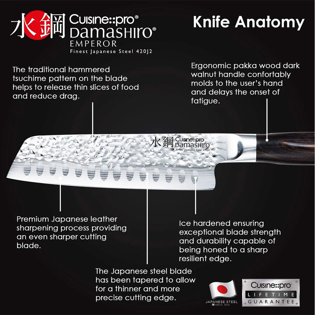 - Cuisine::pro Damashiro Emperor Japanese knives are made from the finest quality Japanese steel. Inspired by traditional Japanese craftsman and Samurai sword makers, these knives are characterized by distinctive damascus-inspired patterns on the blade of banding and mottling reminiscent of flowing water. Damashiro blades are made from specialist ice-hardened Japanese steel which makes them super tough, resistant to shattering, and capable of being honed to a sharp, resilient edge.