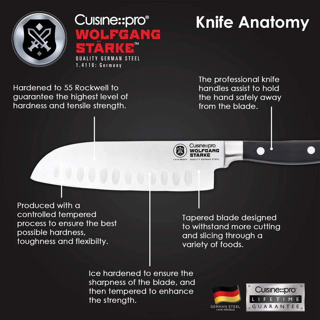 Quality German engineering isn’t just for cars. The Cuisine::pro® Wolfgang Starke™ range is premium quality German engineering for your home. The Cuisine::pro® Wolfgang Starke™ Santoku Knife is a must-have kitchen knife for truly understanding the quality and appeal of this range. Crafted from the finest quality German stainless steel using expert manufacturing techniques that have been developed over centuries, the Cuisine::pro® Wolfgang Starke™ Santoku Knife features a full tang blade that has been triple riveted into its specially moulded polymer handle to ensure exceptional control, balance and handling while cutting. Thanks to a controlled tempering and ice hardening process, the Cuisine::pro® Wolfgang Starke™ Santoku Knife is not only incredibly tough, but flexible enough to adapt to produce of varying consistency. Rockwell Hardness tested to the highest possible level, the Cuisine::pro® Wolfgang Starke™ Santoku Knife is guaranteed to last longer, stay sharper, and absorb less damage over time. Backed by Cuisine::pro®’s Lifetime Guarantee, the quality of the Wolfgang Starke™ Santoku Knife is something you can feel absolute confidence in.