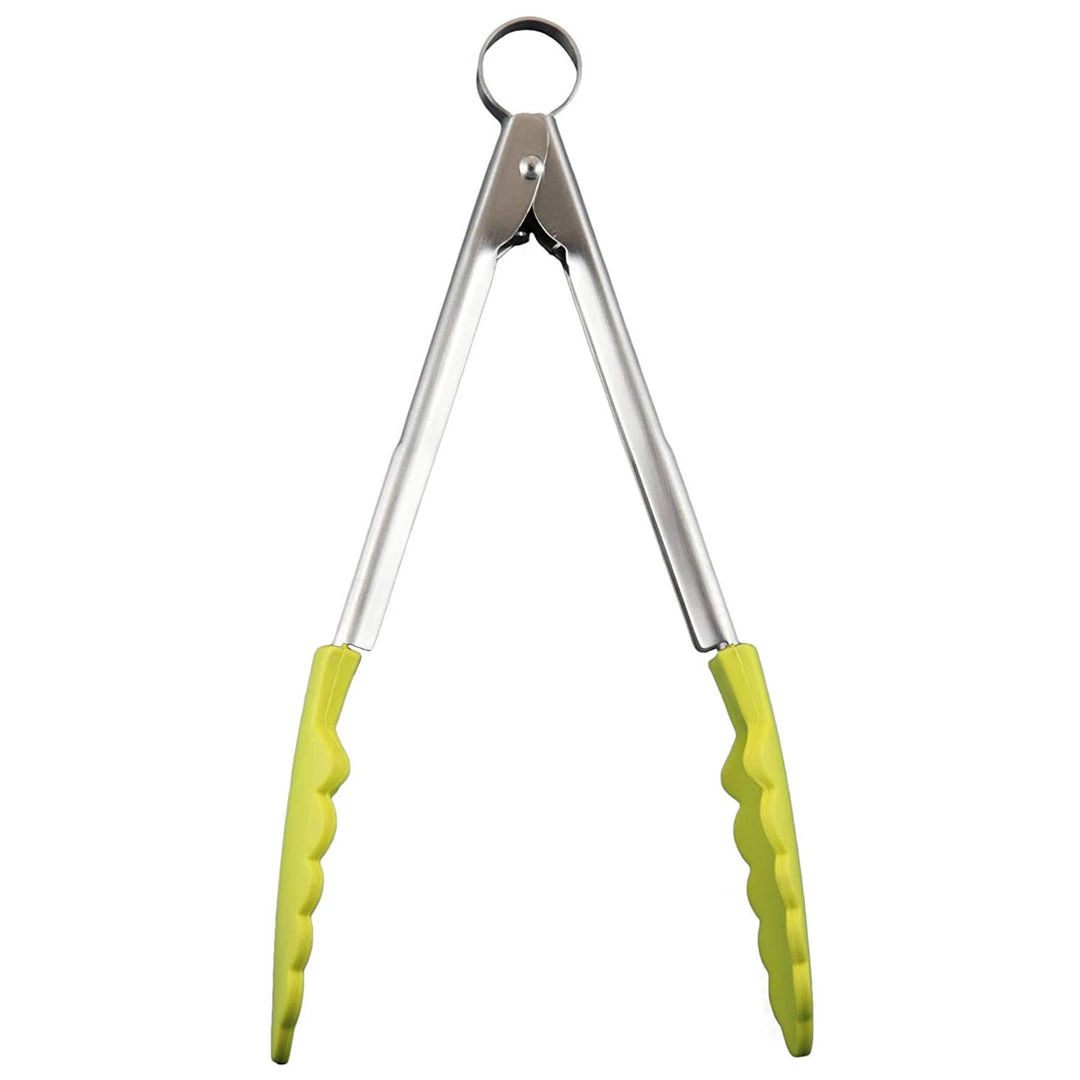Designed to handle both cooking and serving tasks with ease, the Cuisipro tongs are available in a variety of sizes and colors. These tongs have a patented push/pull locking mechanism and can be opened and closed with one hand. They are made of commercial quality stainless steel with non-stick, heat resistant silicone ends. End loop can be used to hang tongs for storage when not in use.