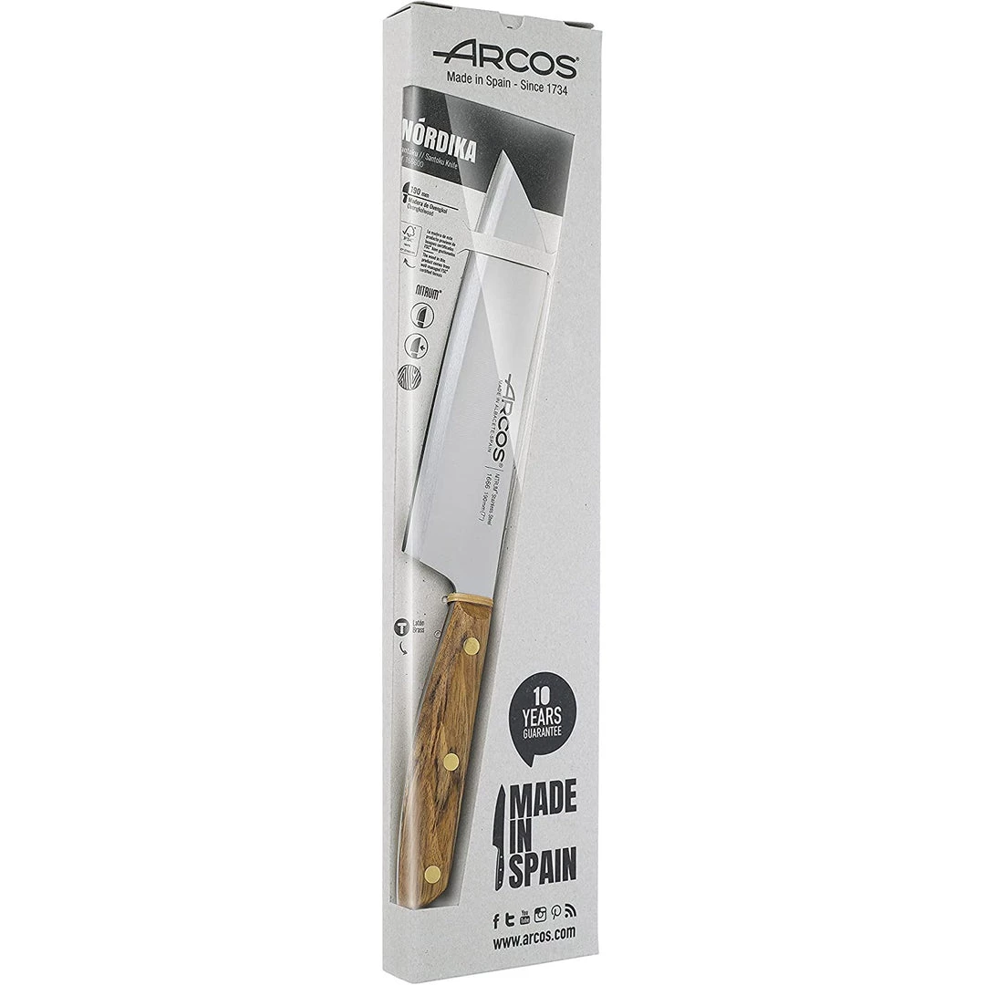 Knife from the Nórdika series highlighted by its special silk edge, which combines the knowledge of our master cutters with the most innovative technology, to achieve a unique cut characterized by its smoothness and precision, which leaves no one indifferent. Another of its main characteristics are its brass rivets that give the handle an avant-garde design. The Nórdika series benefits from a recazo or upper edge of the blade, with a rounded polish, providing a soft grip on the knife, avoiding friction in the hand. Manufactured entirely in our facilities in Albacete, it has a NITRUM stainless steel blade, an exclusive formula of Arcos nitrogen steel that provides more hardness, greater cutting power and improves the durability of the edge; and an Ovengkol wooden handle, which provides a warm touch in the hand during use.
