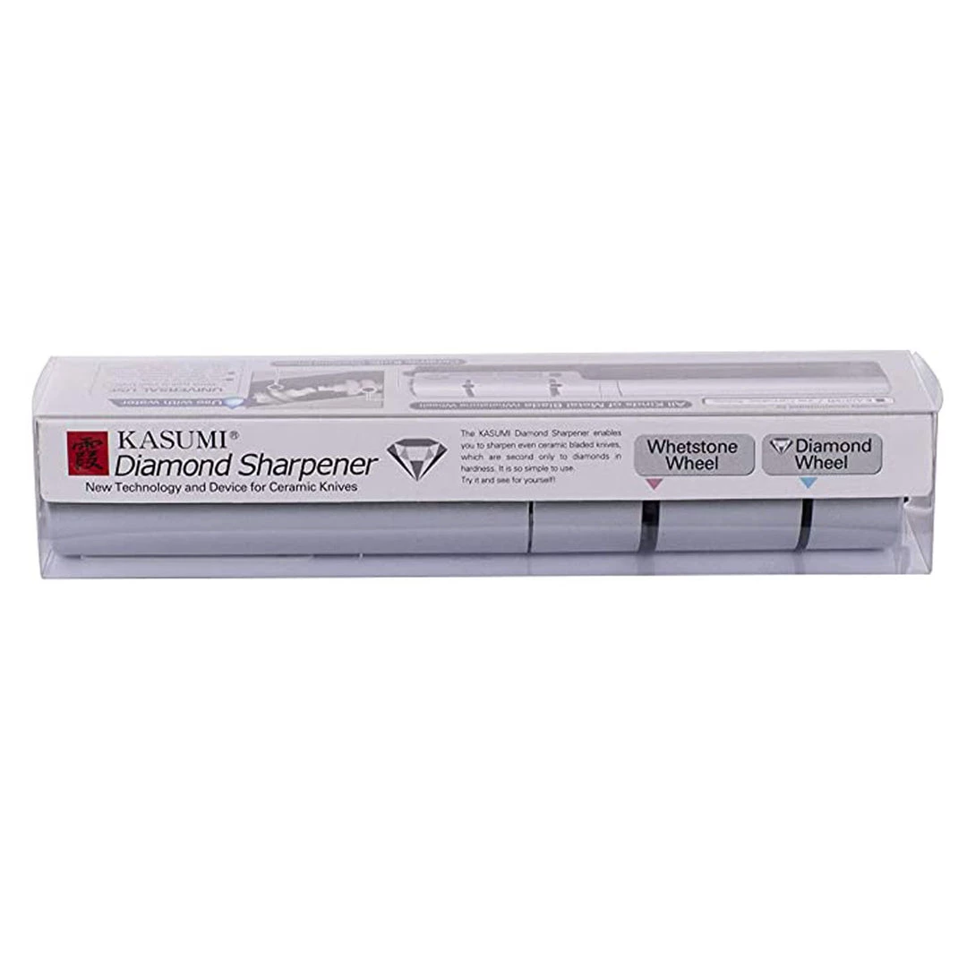 This Sharpener By Kasumi Enables You To Sharpen Even Ceramic Bladed Knives, Which Are Second Only To Diamonds In Hardness. It Is Simple And Easy To Use. It Features Two Wheels, One Is A Ceramic Whetstone Wheel While The Other Is Diamond. Use The Diamond Stage For Your Fine Ceramic Knives, And Use The Whetstone For Your Japanese Style Metal Blade Knives. It Uses Water For Lubrication, And Is Easy To Clean. Use This Sharpener With Your Kasumi Brand Knives, And Any Other Slim Japanese Style Blades. Not For Use With The Broader European Blades.