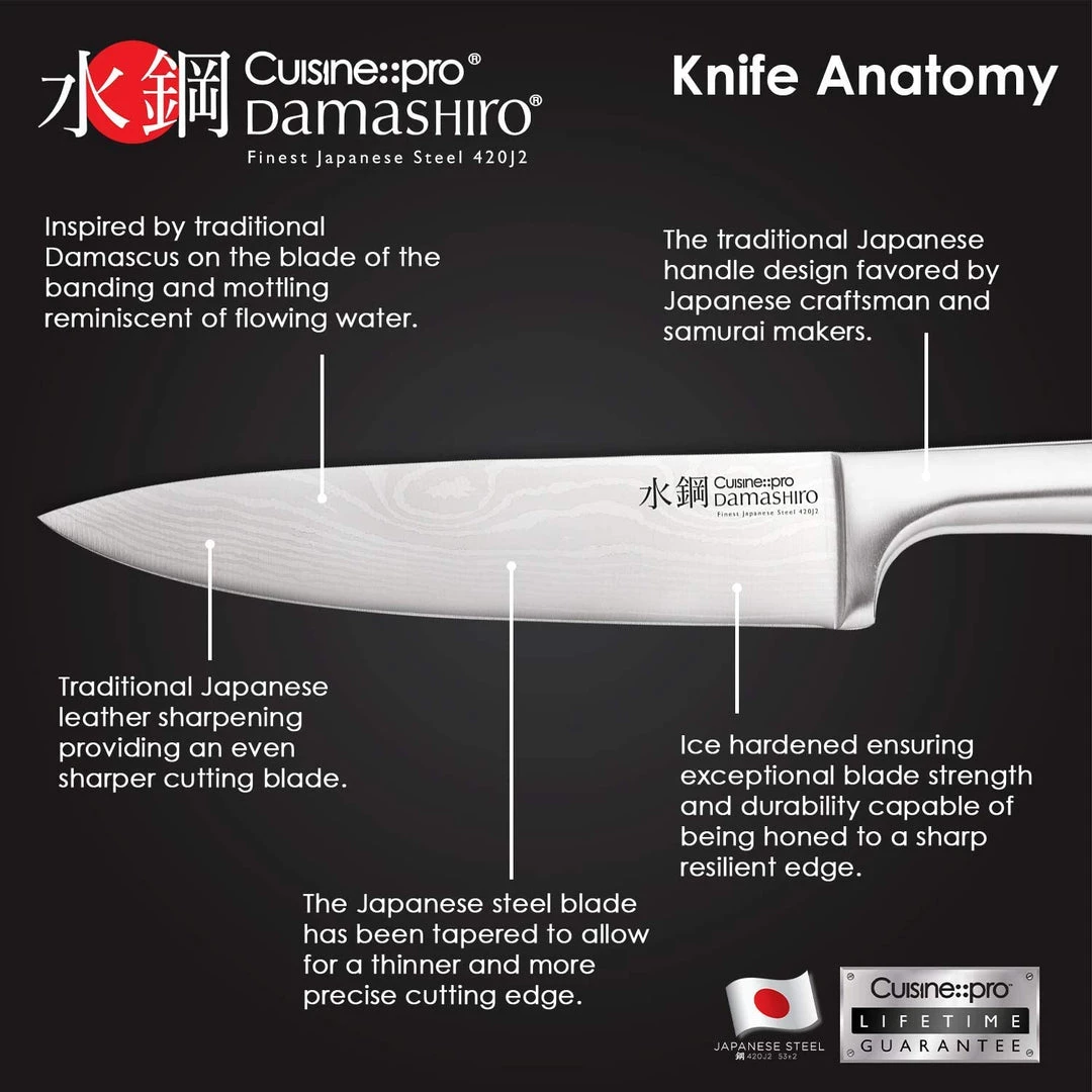 - Cuisine::pro Damashiro knives have been crafted from the finest Japanese Steel 420J2 and ice hardened ensuring for blade strength and durability. The Damashiro range features a distinctive Damascus inspired tradition and traditional Japanese handle design favored by Japanese craftsman samurai makers.
