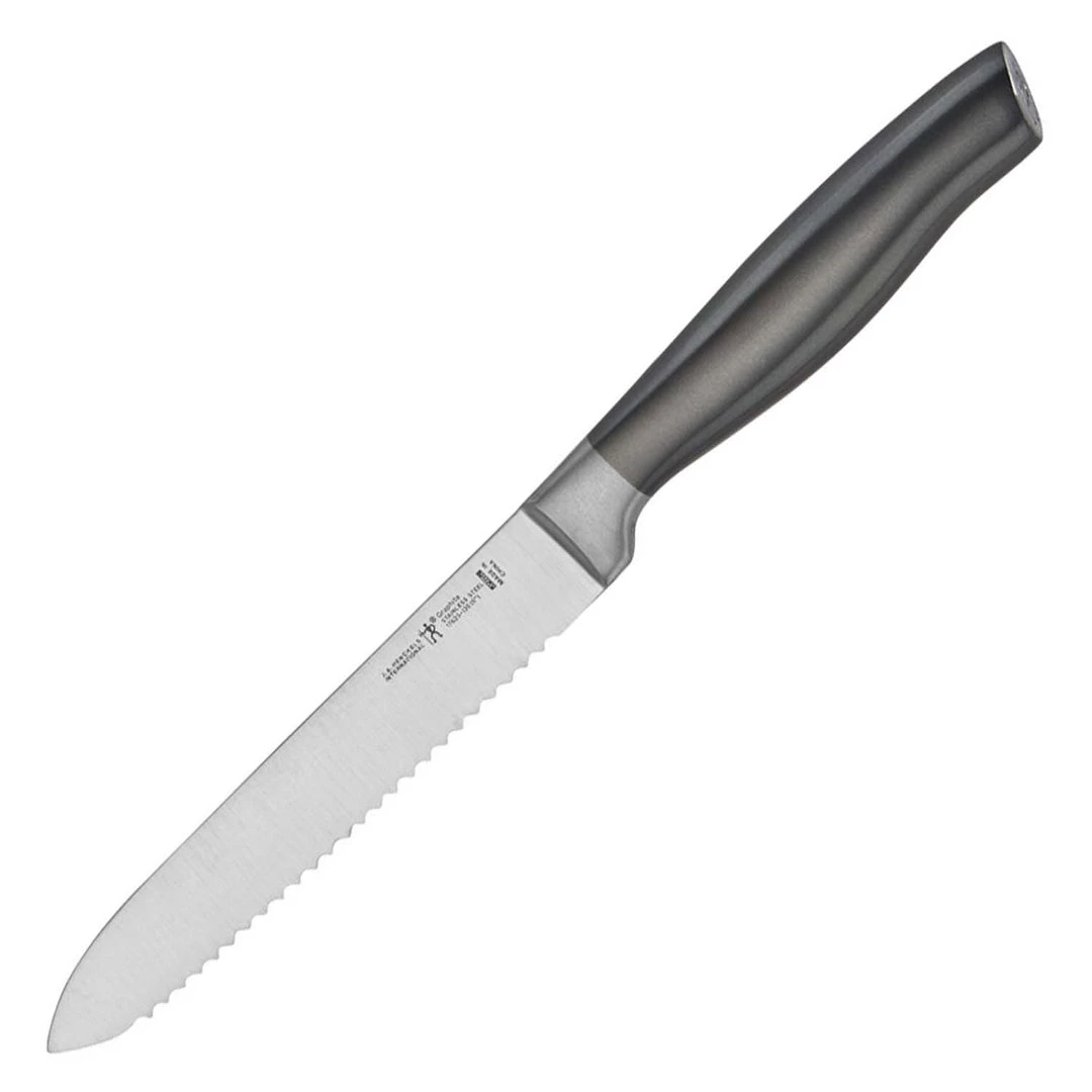 Henckels International makes essential kitchen knives that every home chef needs. Equally ergonomic and stylish, the HI Graphite series offers sleek sharpness. The fully forged bolster construction seamlessly transitions from blade to handle for durability and balance. Fabricated from high-quality stainless steel, the satin-finished blade produces precision cuts and is honed for long-lasting sharpness.