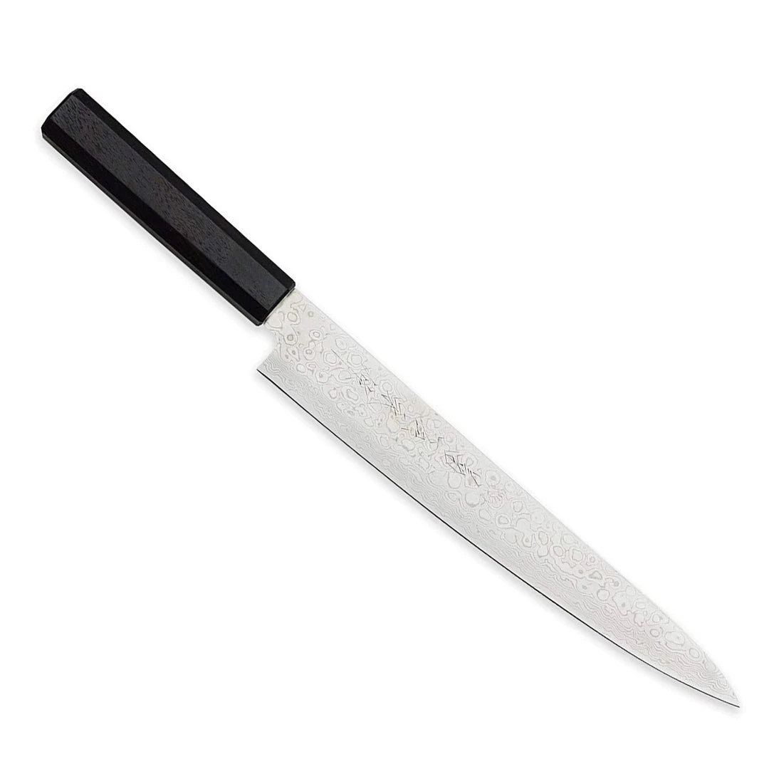 - Blade – 45 layers with a core of Aichi AUS10 Nickel stainless sandwiched between 11 layers of nickel, 6 layers of SUS410 and 5 layers of J1 stainless steel on each side to create the Damascus pattern. These have a thin blade and a light agile feel. Hand engraved with the Kikuichi chrysanthemum logo
