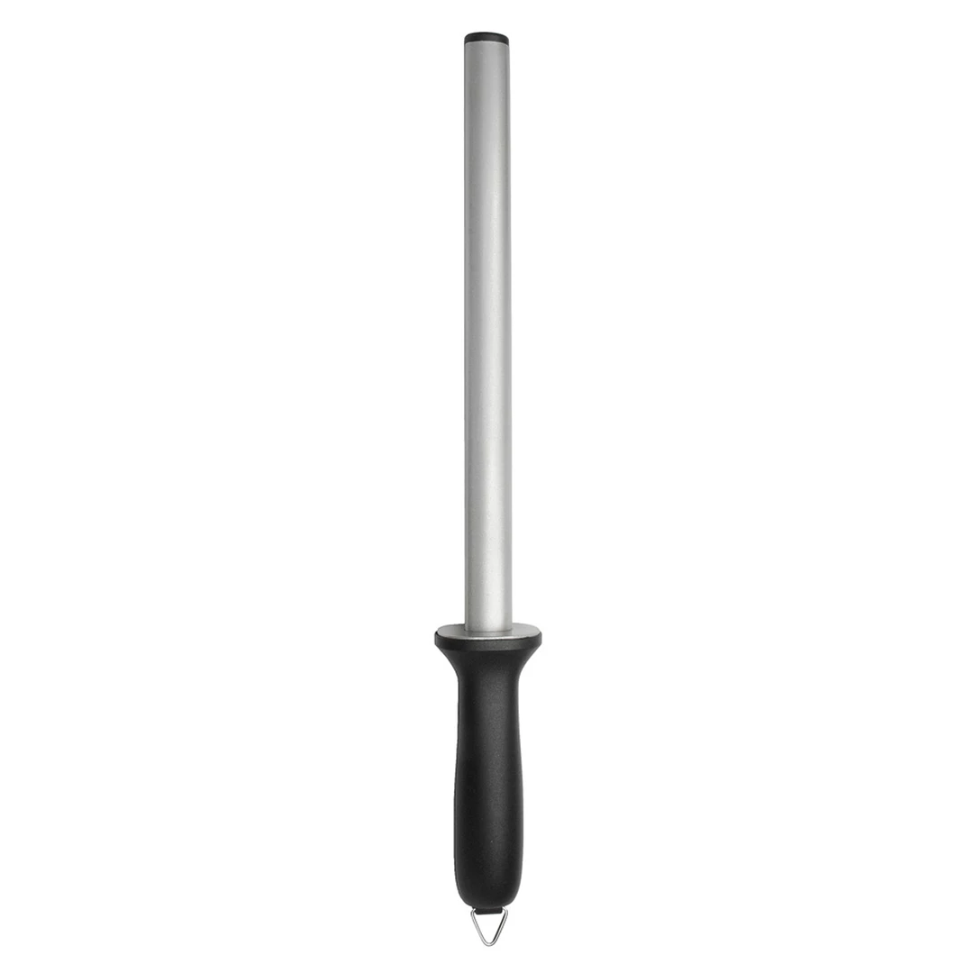 The Messermeister Diamond Sharpening Steel is ideal for restoring the edge of the knife. It is excellent for sharpening stainless steel knives, scissors and other cutting tools. It has a a solid diamond oval sharpening surface, a medium grit for knife maintenance, an abs flared safety handle with a hanging hook, and a non-marking tip that protects supporting surfaces. It cleans with soap and water. It is available in 10″ (DS-10M) and 12″ (DS-12M).