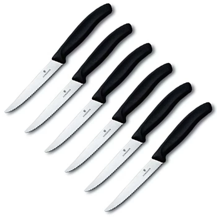 Easily slice and dice ingredients for supper with this six piece serrated steak knife set from Victorinox Swiss. NSF approved and made from stainless steel, they are durable and long lasting. The black ergonomic fibrox handles provide a secure grip and are hygienic and slip resistant. Ideal for fruits, vegetables, and boneless meats the set includes a manufacturer’s limited lifetime warranty and all knives are dishwasher safe for easy cleaning.
