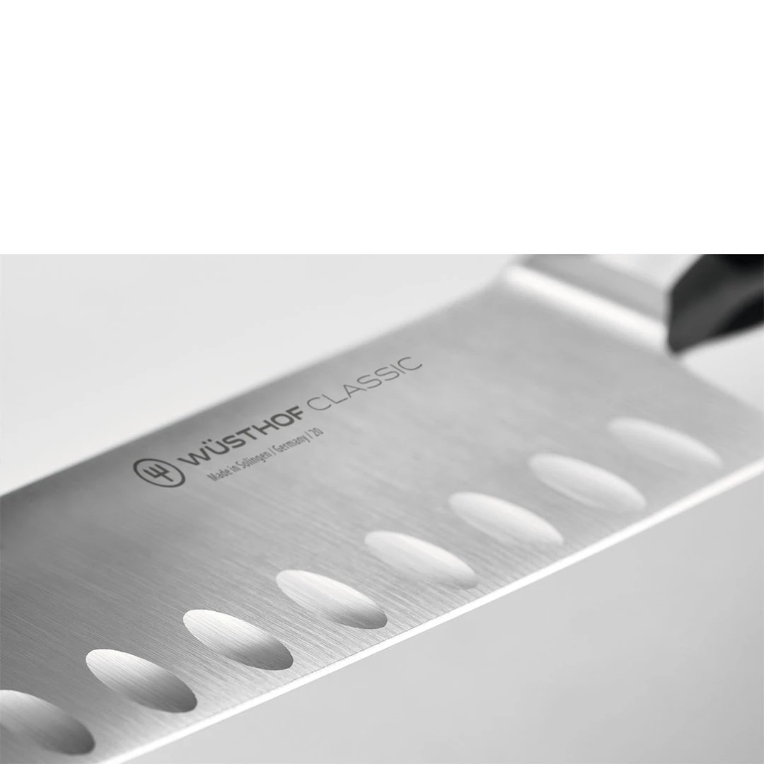 WÜSTHOF’S best-selling collection for generations, CLASSIC full-tang knives are precision-forged from a single piece of exclusive high-carbon stainless steel. CLASSIC knives feature a new handle design made of highly durable synthetic material – Polyoxymethylene (POM) – which has a tighter molecular structure to resist fading and discoloration. The CLASSIC 8″ Carving Knife has a longer and narrower blade than a Cook’s Knife. This allows for the knife to cleanly cut through meats. The pointed tip is designed to help guide meat away from the bone. The hollow edge is crafted with evenly spaced vertical indentations, which create small air pockets between the blade and the food. These small air pockets gently push food off the blade and reduce friction and drag. This knife allows cooks to effortlessly prep a wide