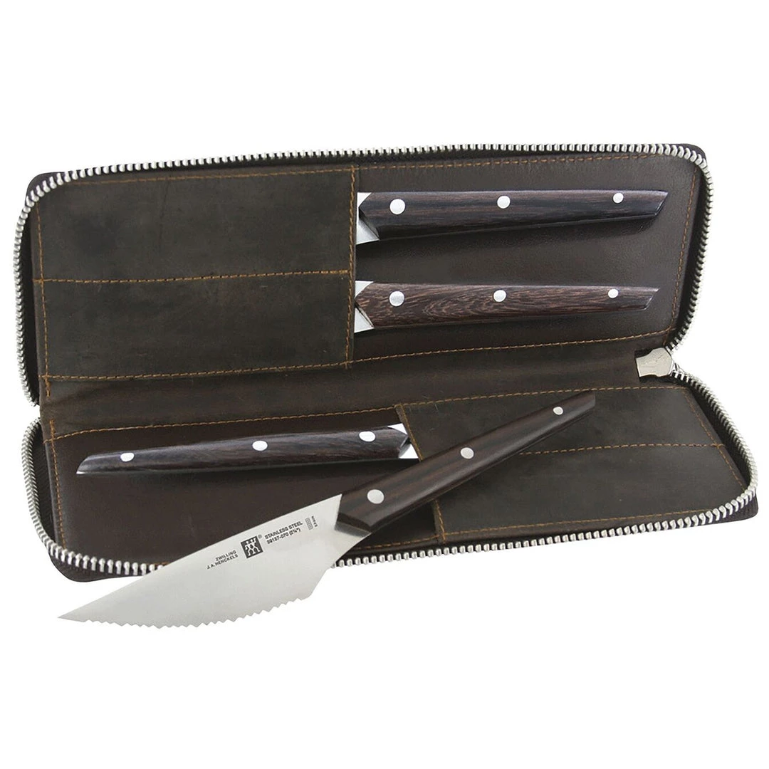 Designed in Germany, Manufactured in Spain. Inverted blade serration for a prolonged cutting edge. ZWILLING Special Formula Steel. Stamped from one single piece of steel. FRIODUR blade, ice-hardened to ~57 Rockwell Hardness. Hand sharpened and polished. Streamline palisander wood handle. Stainless steel three rived handle; pressure sealed. Full tang. Premium leather storage pouch with four individual slots. Specially designed for travel use. Hand-wash.