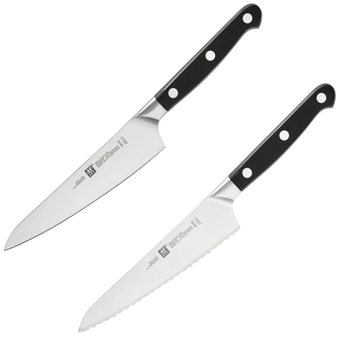 ZWILLING Pro is the most user-friendly knife available to market. The unique blade shape and ergonomic bolster are the result of 280 years of experience in knife making, and the rigorous study of how knives are used. A unique curved bolster supports the professional pinch grip, with thumb and index finger on the blade, for safe cutting and less fatigue. The full length of the blade can be used when cutting and can be sharpened from bolster to tip. Designed in Italy by Matteo Thun and made in Germany by ZWILLING J.A. Henckels, the company that sets the standard for exceptional cutlery worldwide. The ZWILLING Pro 2-pc Prep Set will become the go-to knives in your kitchen. They excel at a multitude of tasks like peeling and chopping vegetables and fruit, slicing meats and cheeses, butterflying chicken breasts, deveining shrimp and much more. The well-designed blade of the allows for plenty of knuckle clearance when you’re chopping on a cutting board yet is small enough for in-hand paring tasks, such as peeling and trimming apples and potatoes.