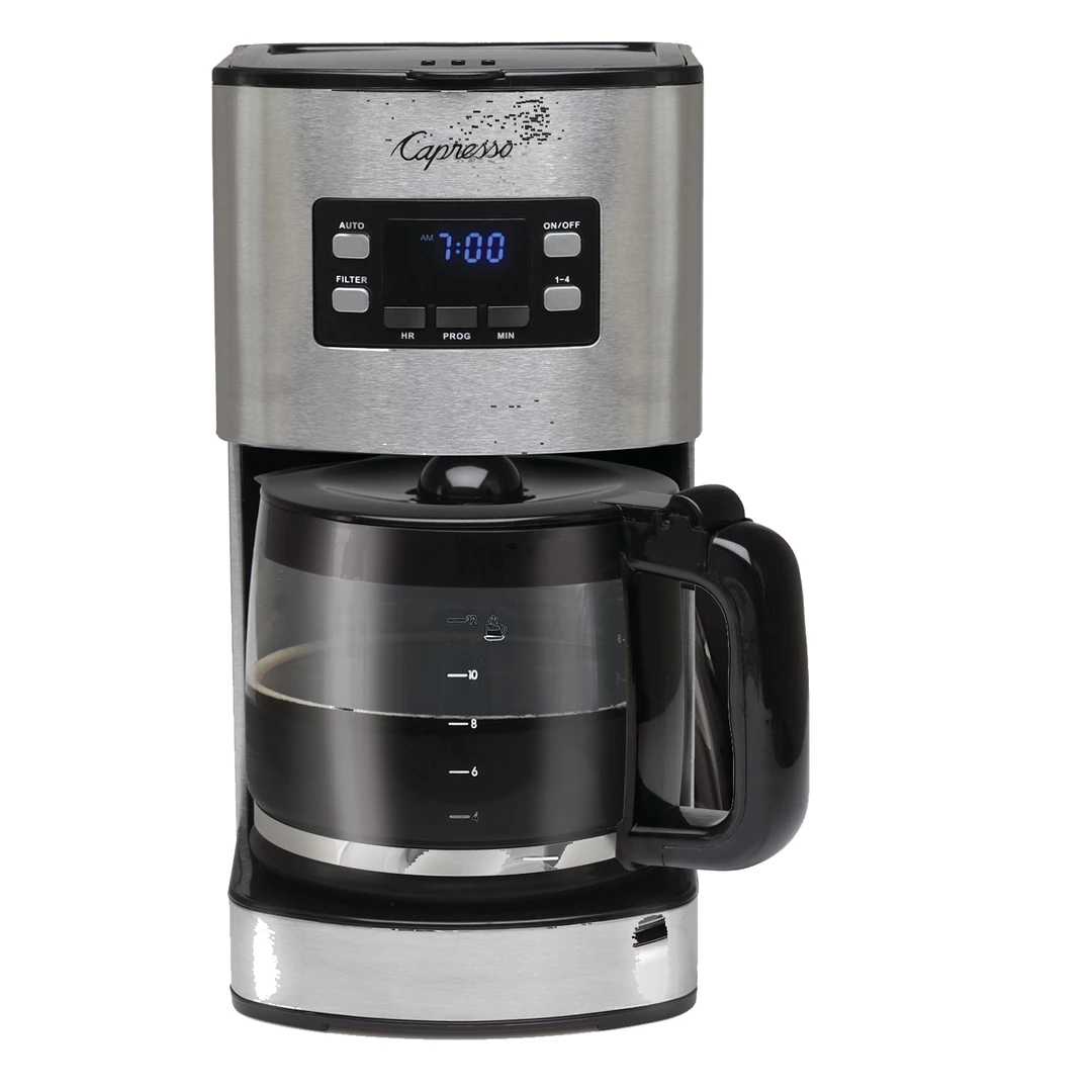 Sleek and stylish, the SG300 features a stainless steel machine body that will look gorgeous on any kitchen countertop. Any easy-to-read external water level indicator and fully programmable LCD display makes brewing coffee a breeze. The reusable GoldTone filter and glass carafe with brew though lid and drip-free pouring spout are dishwasher safe, making clean-up quick and easy. The 1-4 cup setting extends the brew time for added aroma when brewing smaller batches of coffee.